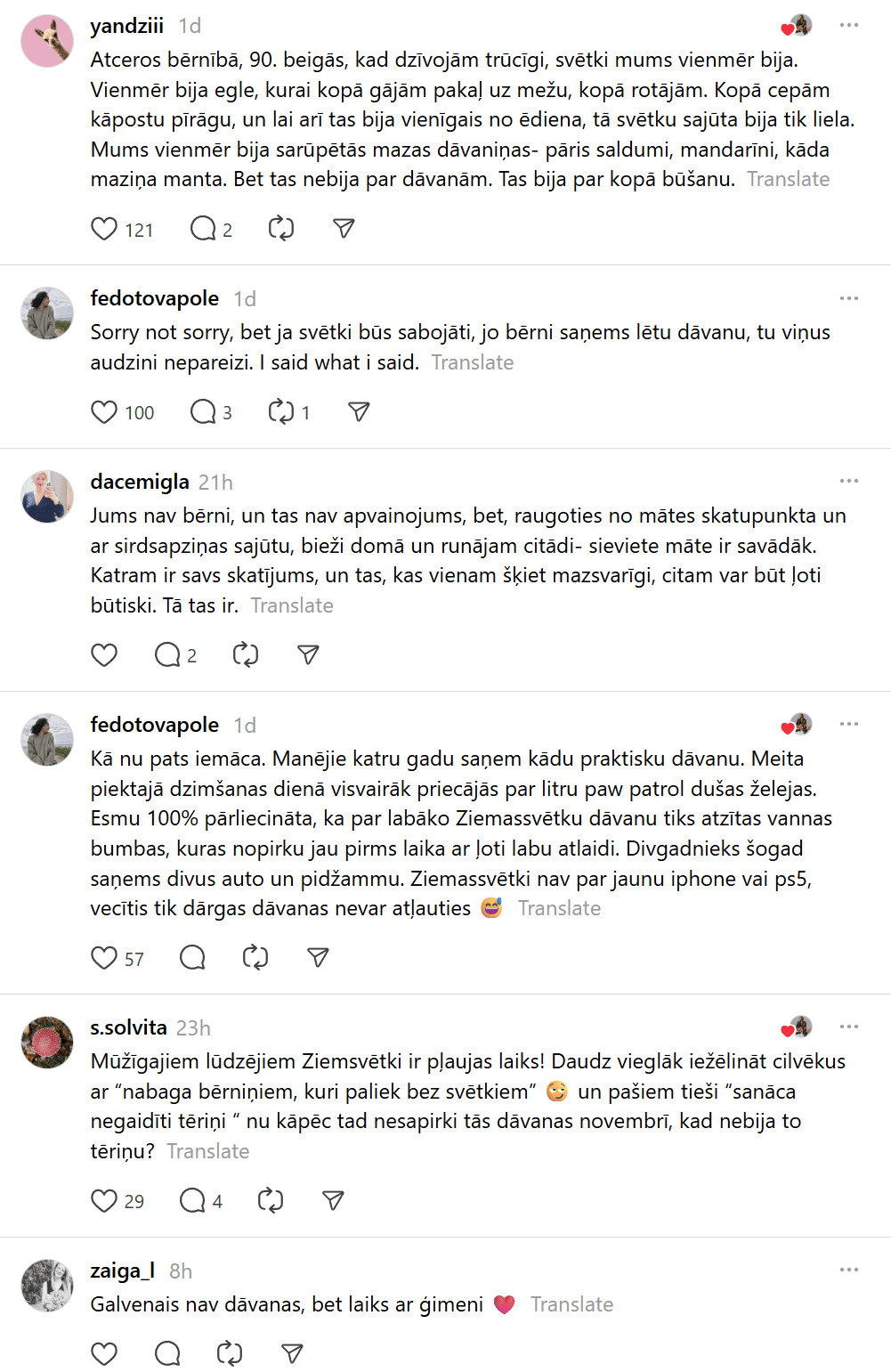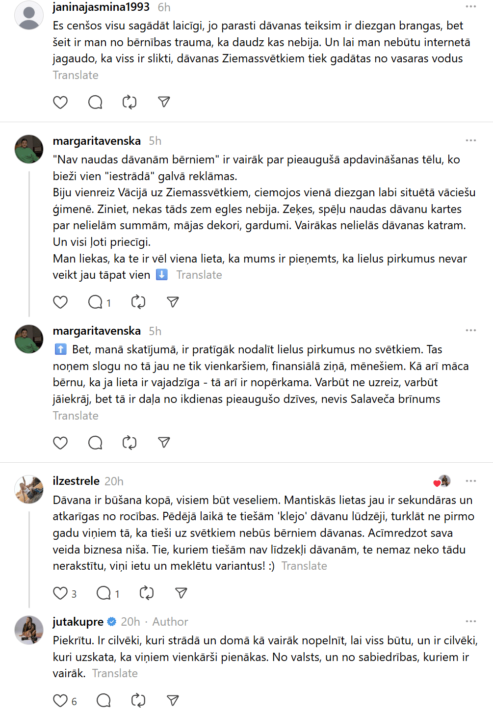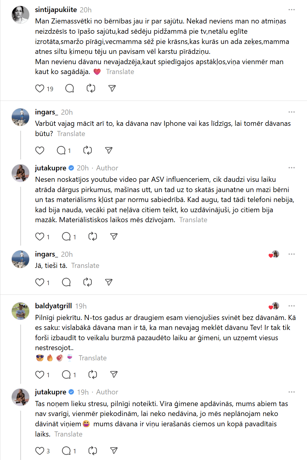 Latviešu modele un influencere Juta Kupre, kura pārcēlusies uz dzīvi ASV, sociālajā tīklā “Threads” paudusi kritiku par tādiem ierakstiem. Viņa raksta: “Tik daudzus redzu šeit sūdzoties par to, ka nevar atļauties bērniem dāvanas, ka tāpēc nebūšot Ziemassvētku utt. Pat man kā diezgan naivam cilvēkam, cilvēkam, kas tic cilvēkiem un cilvēcībai, ir sajūta, ka šie posti nav īsti, tie ir radīti ar mērķi gūt labumu.
