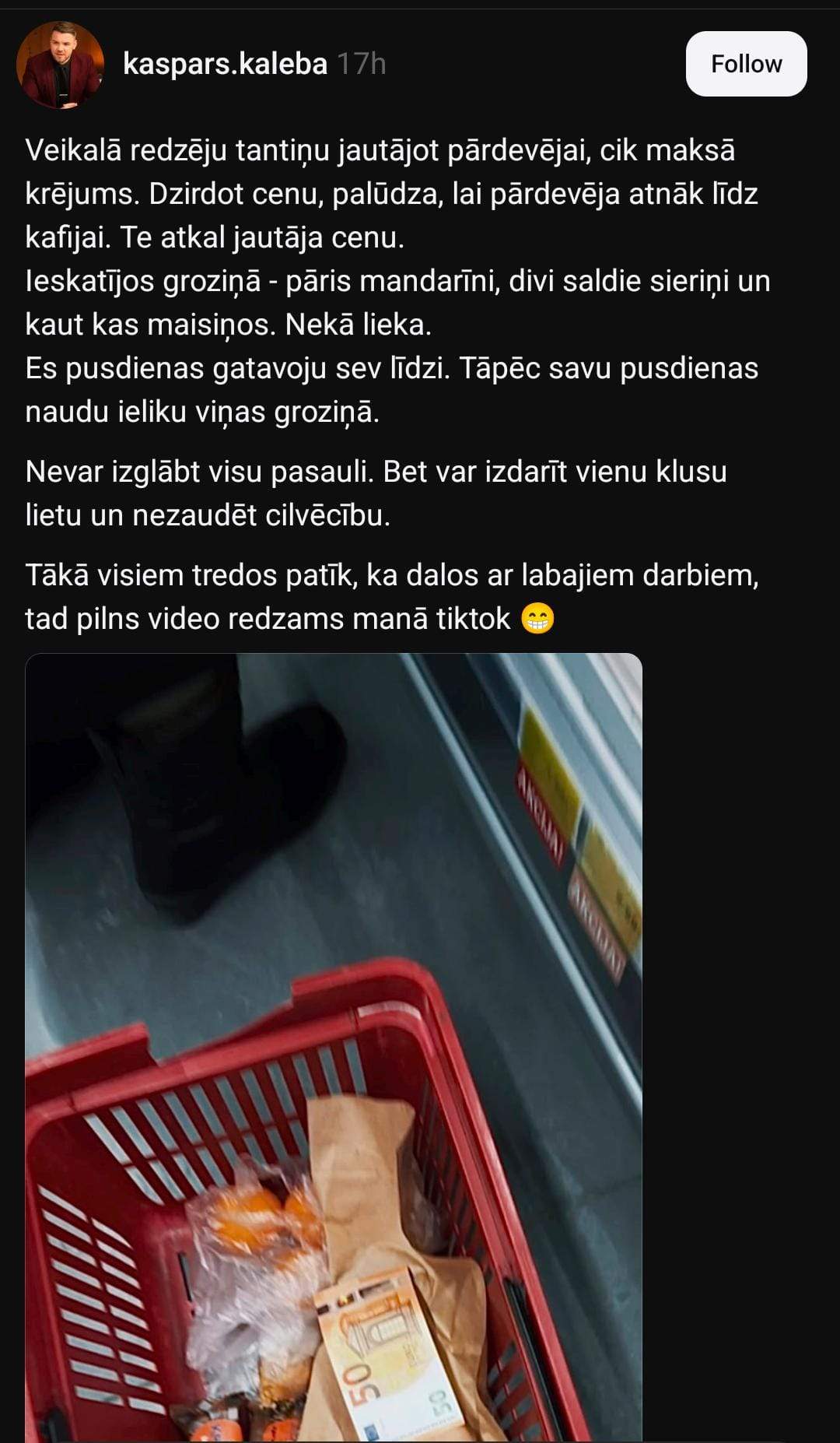 Sociālo mediju platformā “Threads” Kaspars dalās pieredzē: “Veikalā redzēju tantiņu, kura jautāja pārdevējai, cik maksā krējums. Dzirdot cenu, palūdza, lai pārdevēja atnāk līdz kafijai un vēlreiz pārbaudītu cenu.