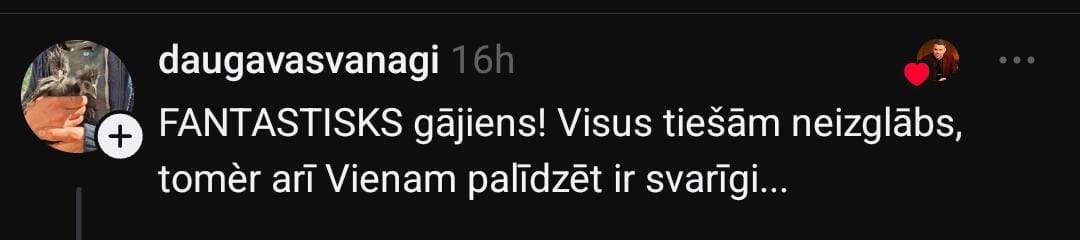 Arī Agnese atzinīgi vērtē vīrieša rīcību: “Skaisti izdarīts. Nav iespējams palīdzēt visiem, bet šoreiz tu kādam dienu noteikti padarīji vieglāku. Paldies, ka nepagāji garām.”
