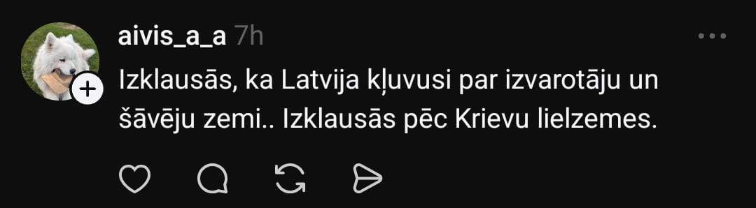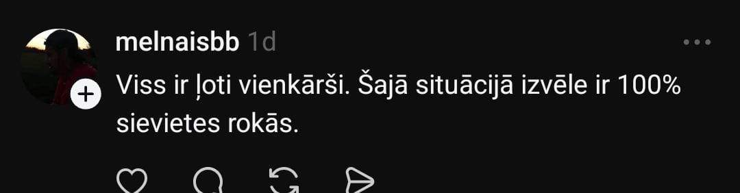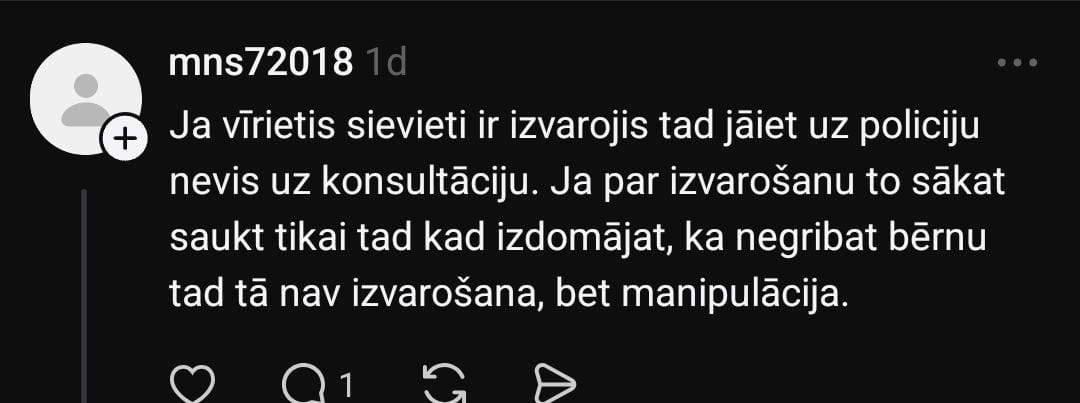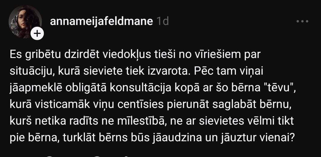 Anna sociālo mediju platformā “Threads” raksta: “Es gribētu dzirdēt viedokļus tieši no vīriešiem par situāciju, kurā sieviete tiek izvarota. Pēc tam viņai jāapmeklē obligātā konsultācija kopā ar šo bērna “tēvu”, kurā visticamāk viņu centīsies pierunāt saglabāt bērnu, kurš netika radīts ne mīlestībā, ne ar sievietes vēlmi tikt pie bērna, turklāt bērns būs jāaudzina un jāuztur vienai?”