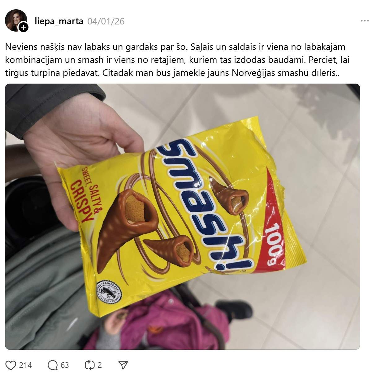 Marta aizsākusi diskusiju, pati rakstīdama: “Neviens našķis nav labāks un gardāks par šo. Sāļais un saldais ir viena no labākajām kombinācijām un smash ir viens no retajiem, kuriem tas izdodas baudāmi. Pērciet, lai tirgus turpina piedāvāt. Citādāk man būs jāmeklē jauns Norvēģijas smashu dīleris..”