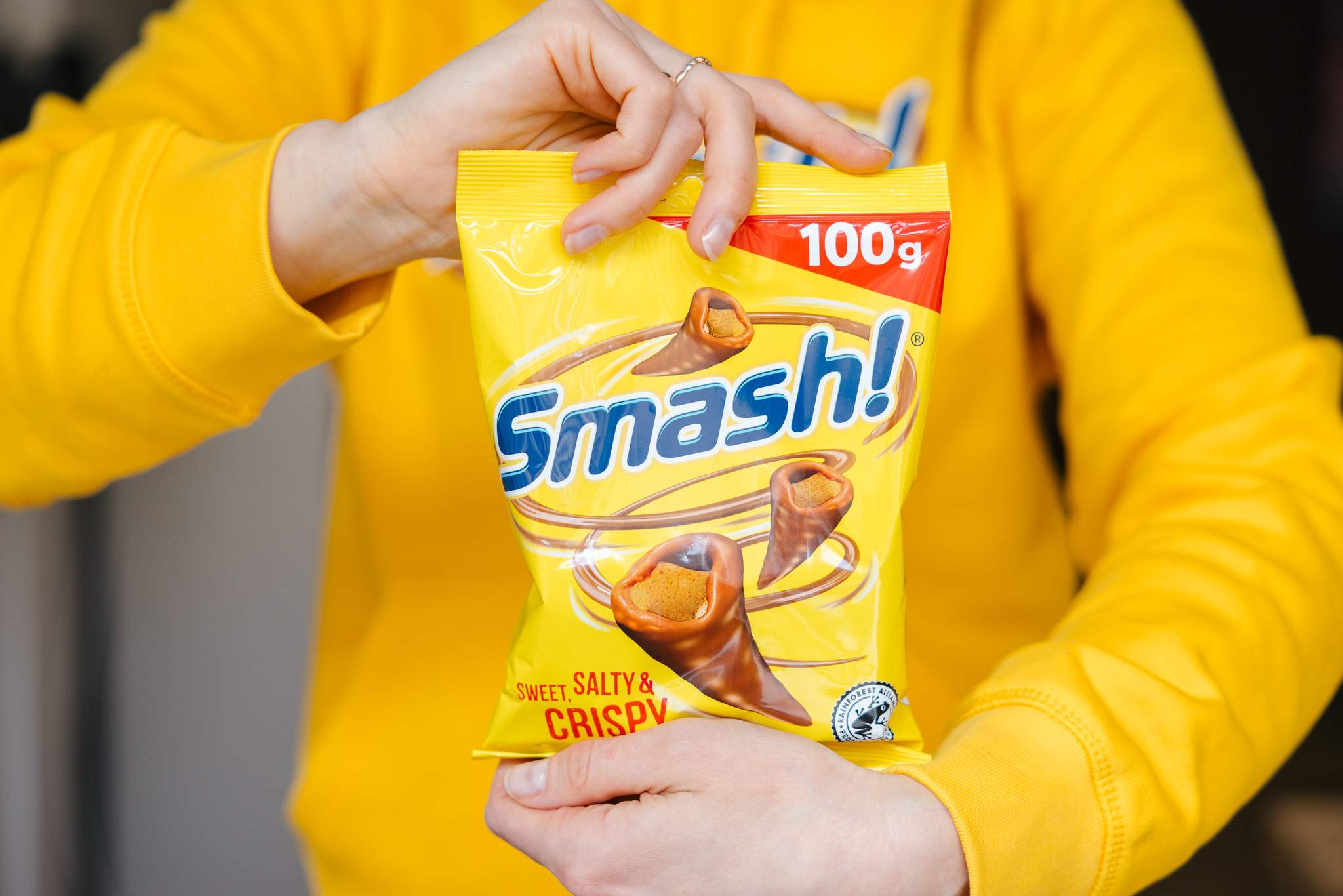 Jaunais produkts ir domāts brīžiem, kad kārojas kaut ko saldu, sāļu vai kraukšķīgu. Tā garšu un tekstūru kombinācija ir tik netipiska un reizē neatvairāma, ka ir teju neiespējami apstāties un apēst tikai vienu ar piena šokolādi apklāto kukurūzas konusiņu. Nosaukums “Smash!” atsaucas uz garšas un tekstūras satriecošo pieredzi. Un, kā norāda zīmola vadītāji, izsaukuma zīme zīmola nosaukumā ir neatņemama tā daļa.