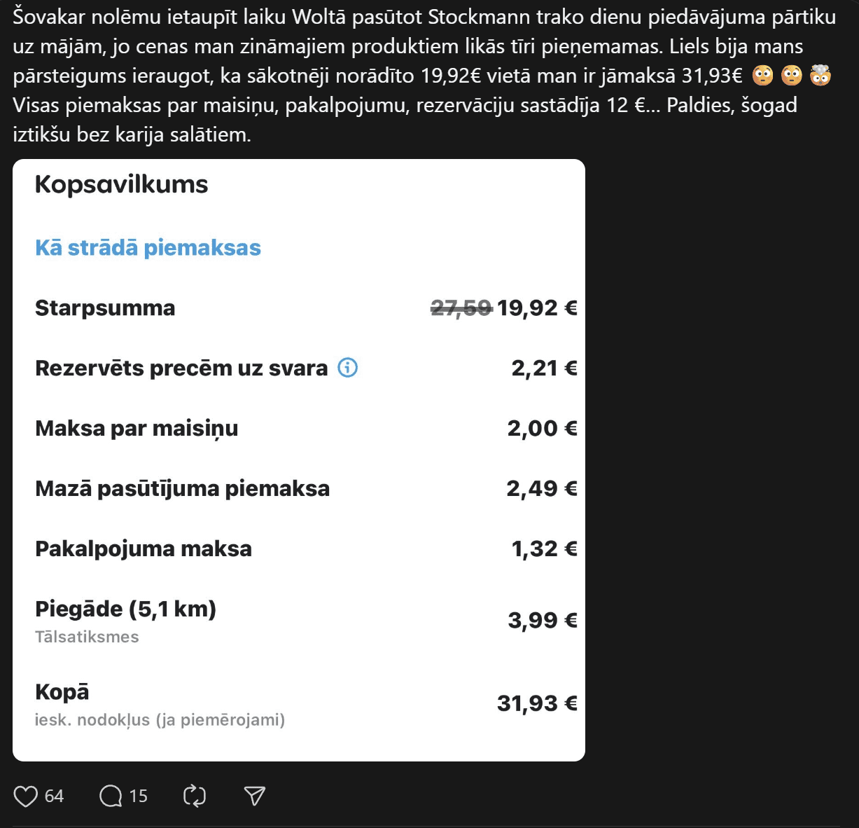 “Šovakar nolēmu ietaupīt laiku “Wolt” pasūtot Stockmann trako dienu piedāvājuma pārtiku uz mājām, jo cenas man zināmajiem produktiem likās tīri pieņemamas. Liels bija mans pārsteigums ieraugot, ka sākotnēji norādīto 19,92 eiro vietā man ir jāmaksā 31,93 eiro. Visas piemaksas par maisiņu, pakalpojumu, rezervāciju sastādīja 12 €… Paldies, šogad iztikšu bez karija salātiem.