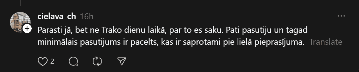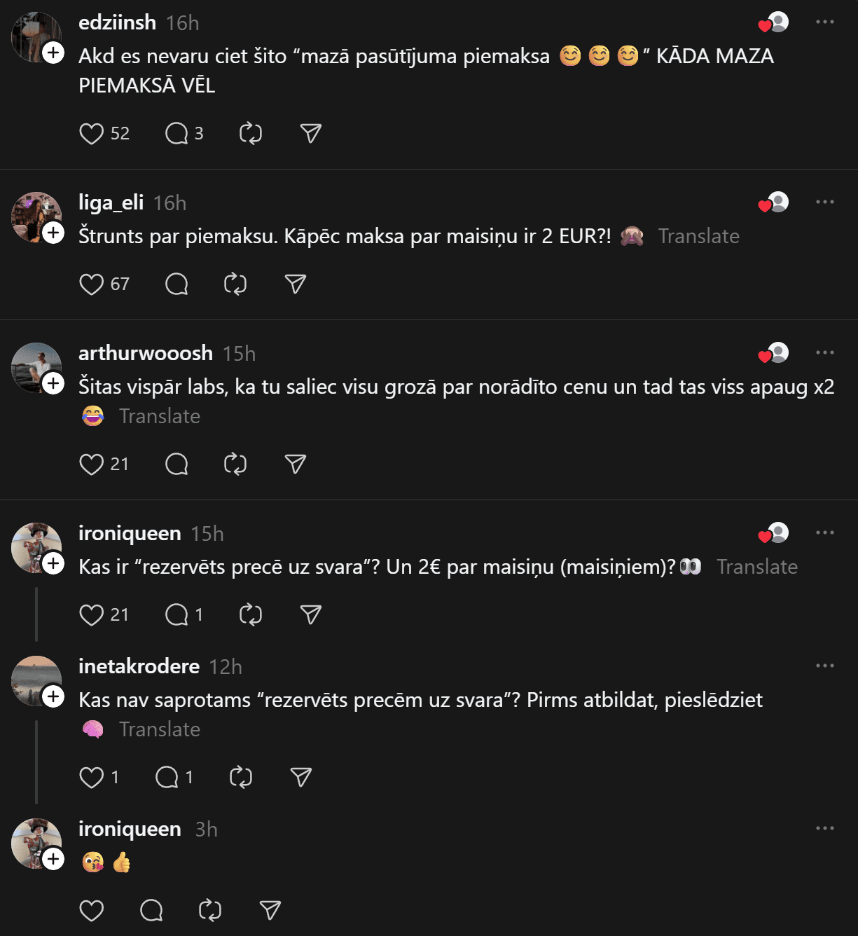 Vēl kāds komentētājs ironizē: “Saliec grozā par norādīto cenu, un tad tas viss pēkšņi kļūst divreiz dārgāks.” Savukārt citi norāda, ka pie noteiktiem pasūtījuma apjomiem piemaksas varētu nebūt, taču realitātē minimālā summa bieži vien tiek palielināta.