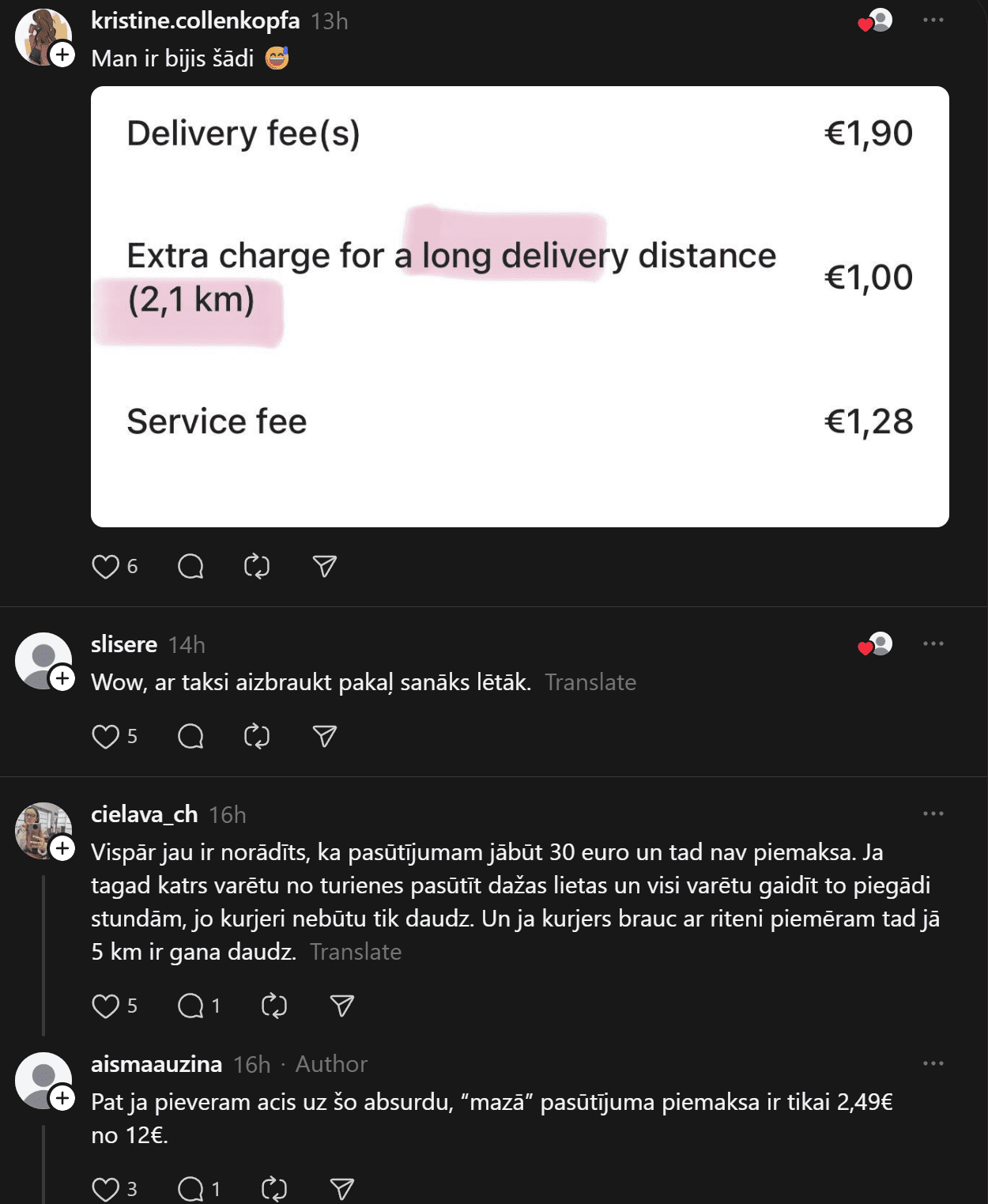 Kāda lietotāja dalījusies ar pieredzi, ka, pasūtot pārtiku, sākotnēji norādītā summa 19,92 eiro pieauga līdz 31,93 eiro. Starpība – vairāk nekā 12 eiro – veidojusies no dažādām piemaksām: maksa par maisiņu, pakalpojuma maksa, neliela pasūtījuma piemaksa, piegādes izmaksas, kā arī maksa par “rezervētām precēm uz svara”.