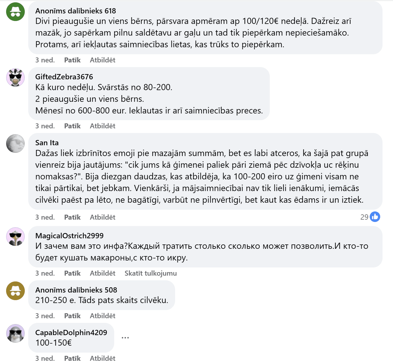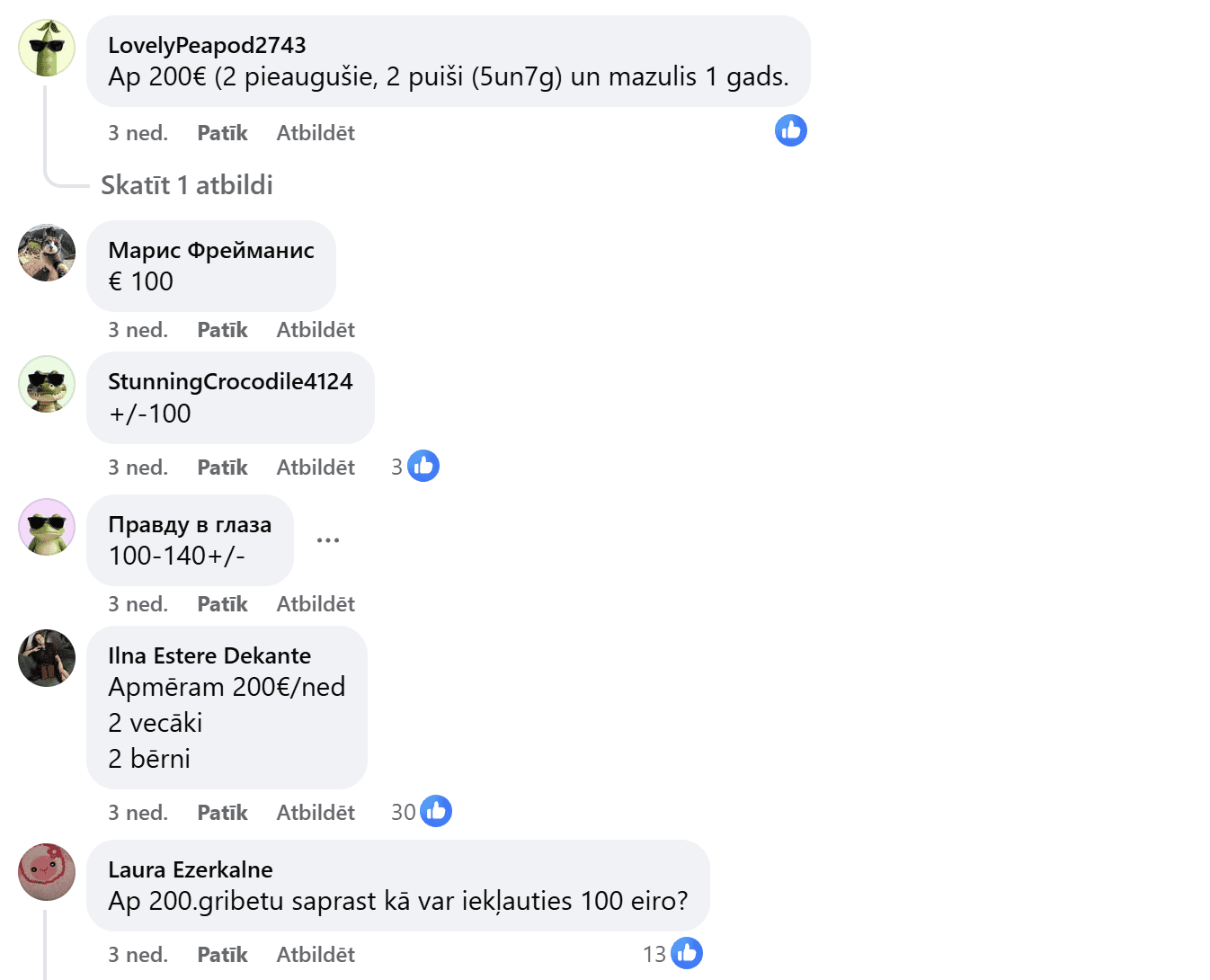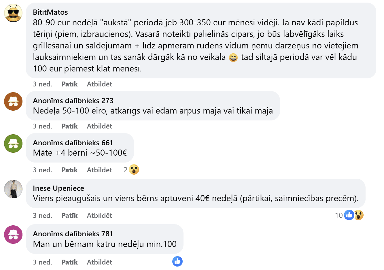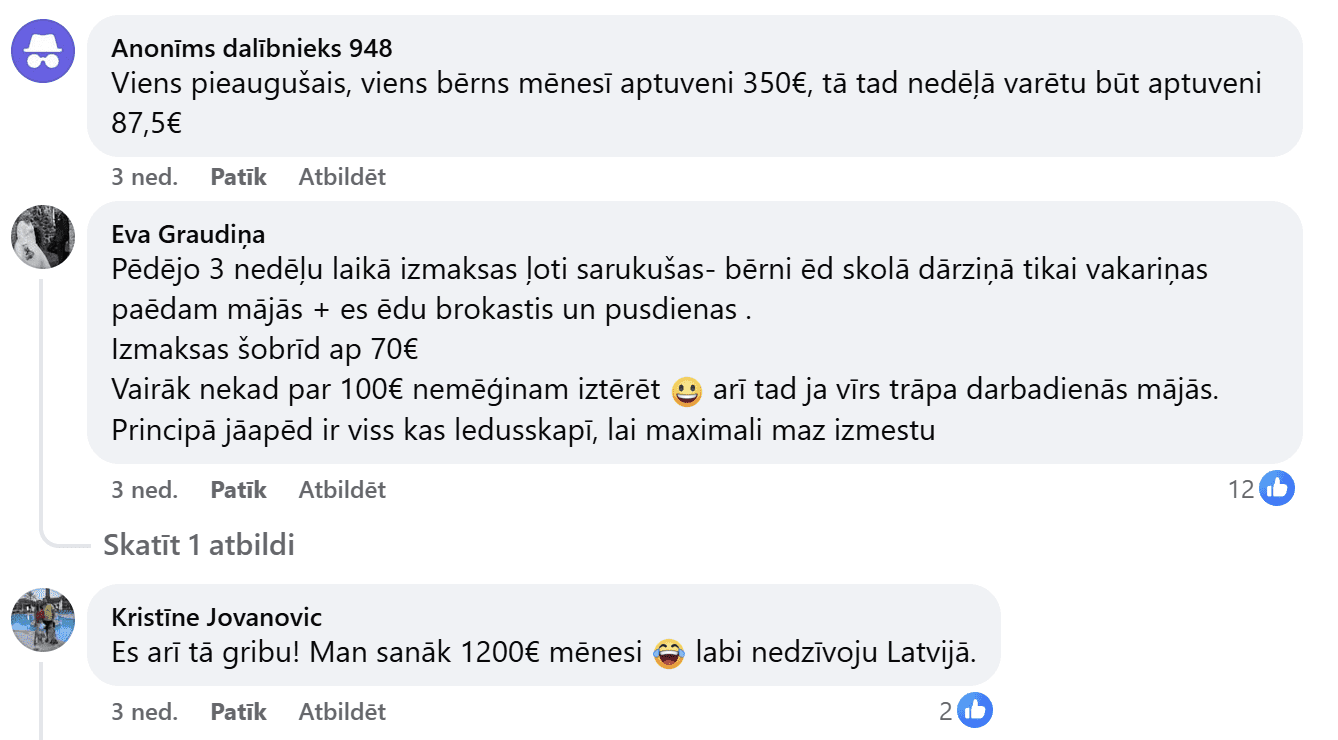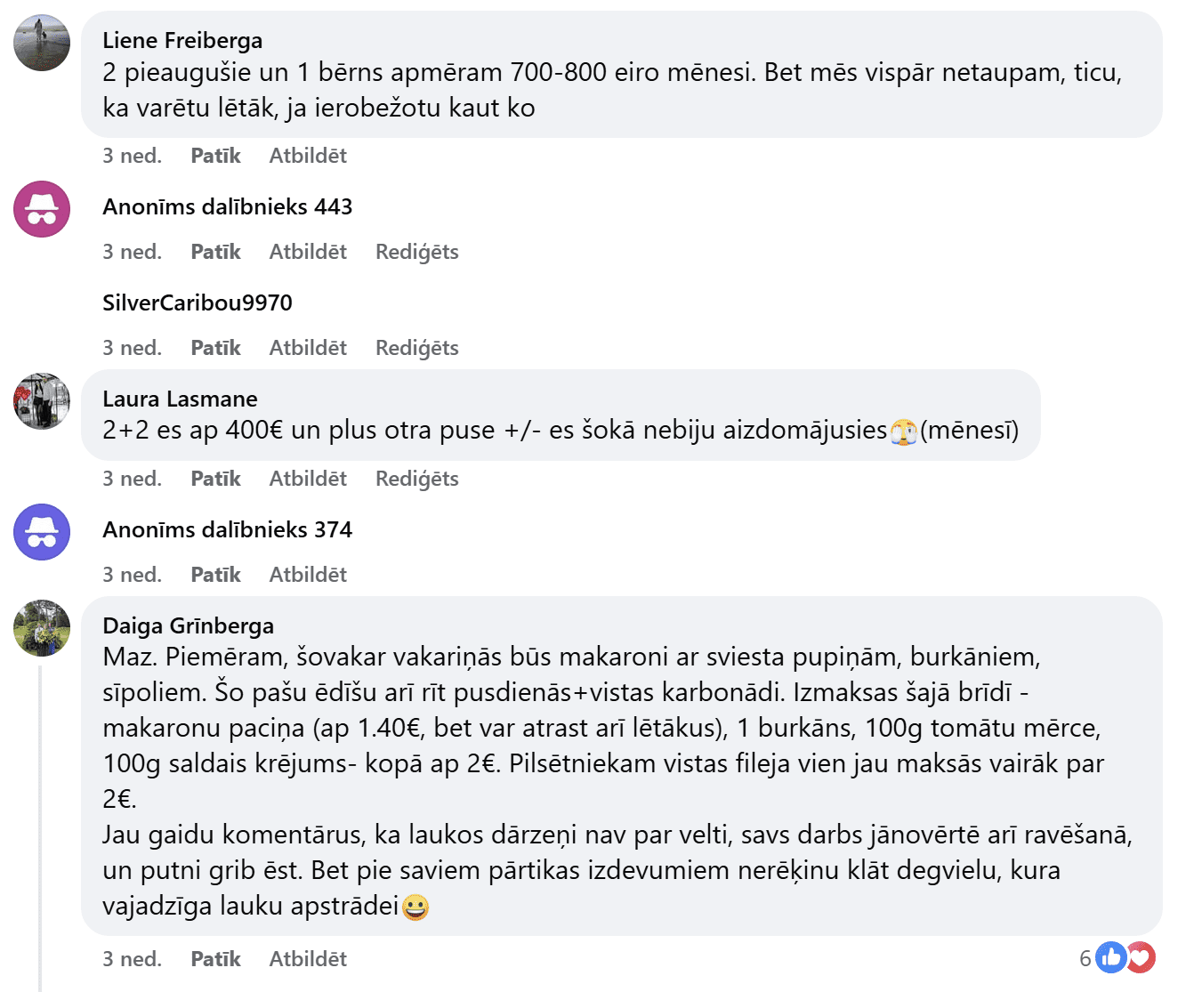 Vēl kāds komentē: “Mums no 3 cilvēku ģimenes sanāk 300 -370 eiro katru mēnesi. Maltītes plānoju un ari pa reizei kaut ko garšīgu uztaisu.”