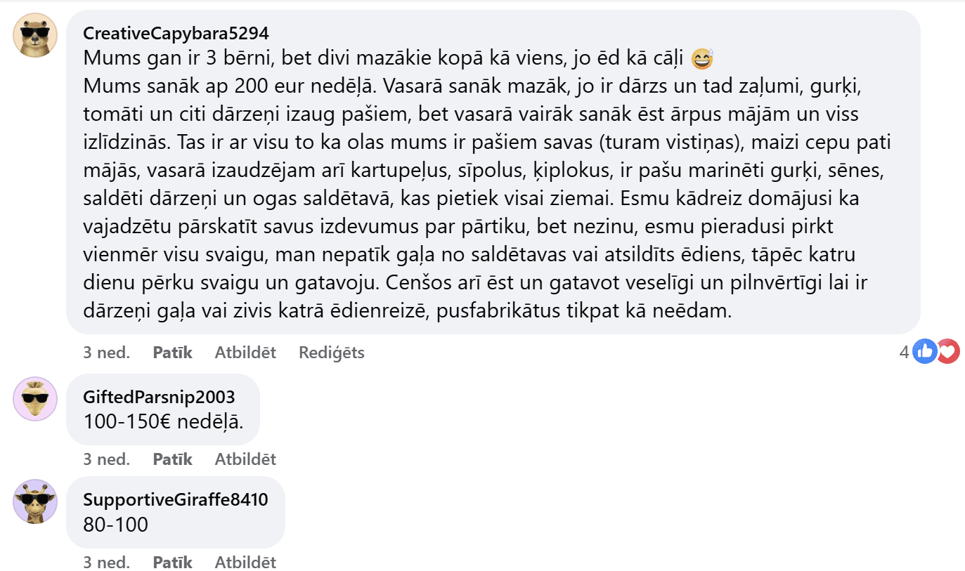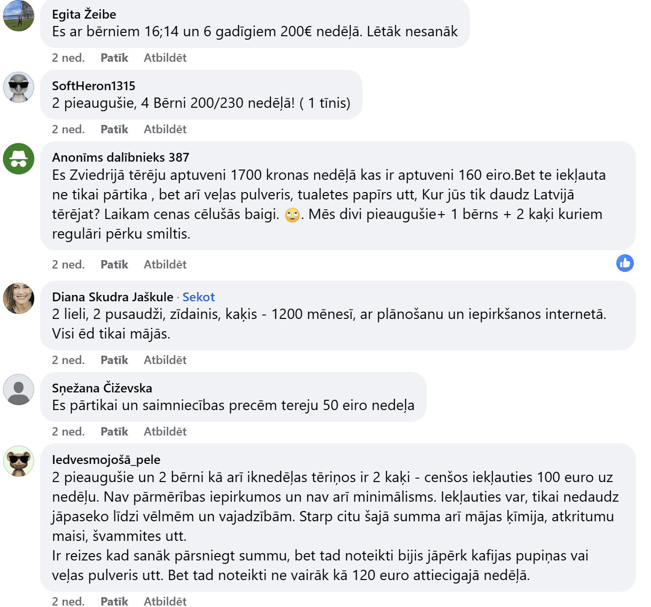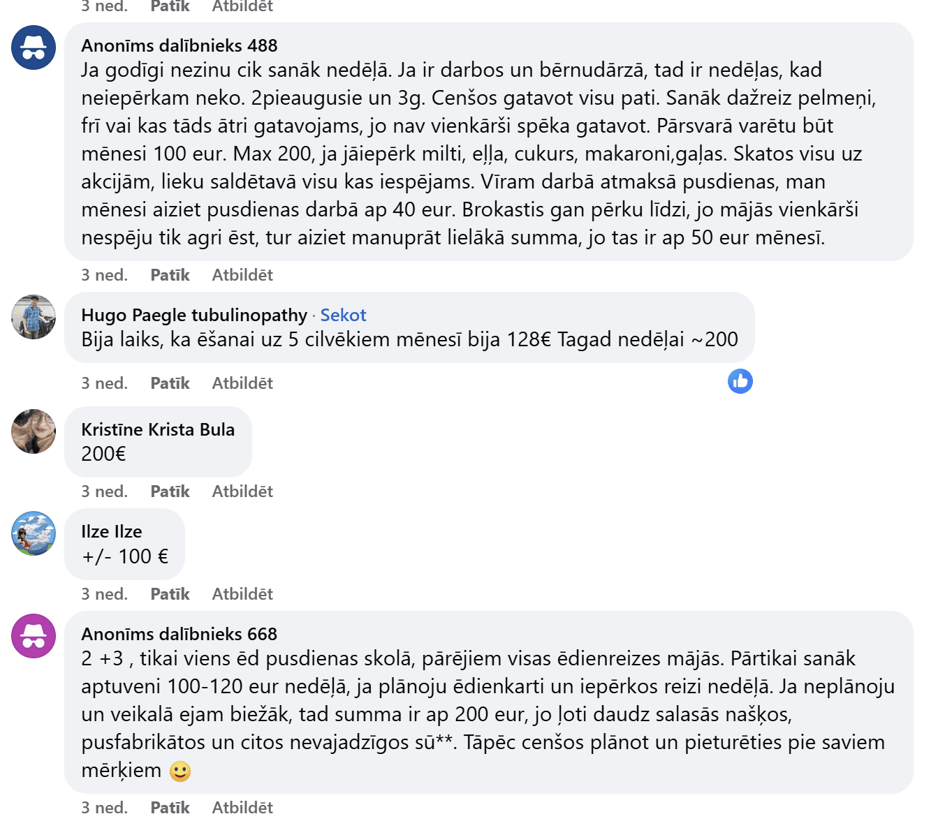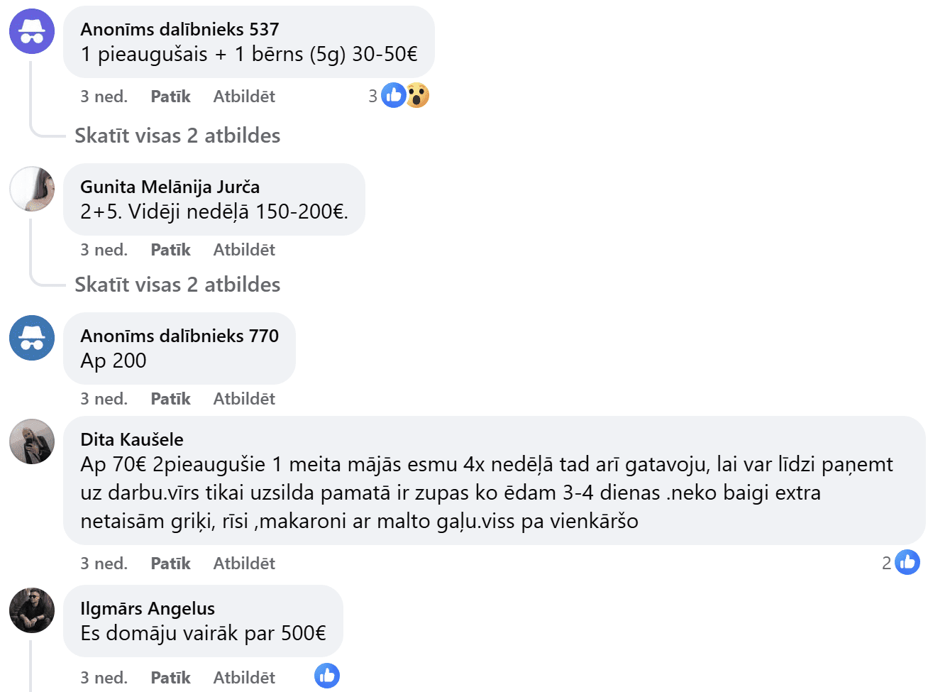 Dita norāda: “Ap 70 eiro 2 pieaugušie 1 meita mājās esmu 4x nedēļā tad arī gatavoju, lai var līdzi paņemt uz darbu. Vīrs tikai uzsilda pamatā ir zupas ko ēdam 3-4 dienas. Neko baigi ekstra netaisām griķi, rīsi, makaroni ar malto gaļu. Viss pa vienkāršo.”