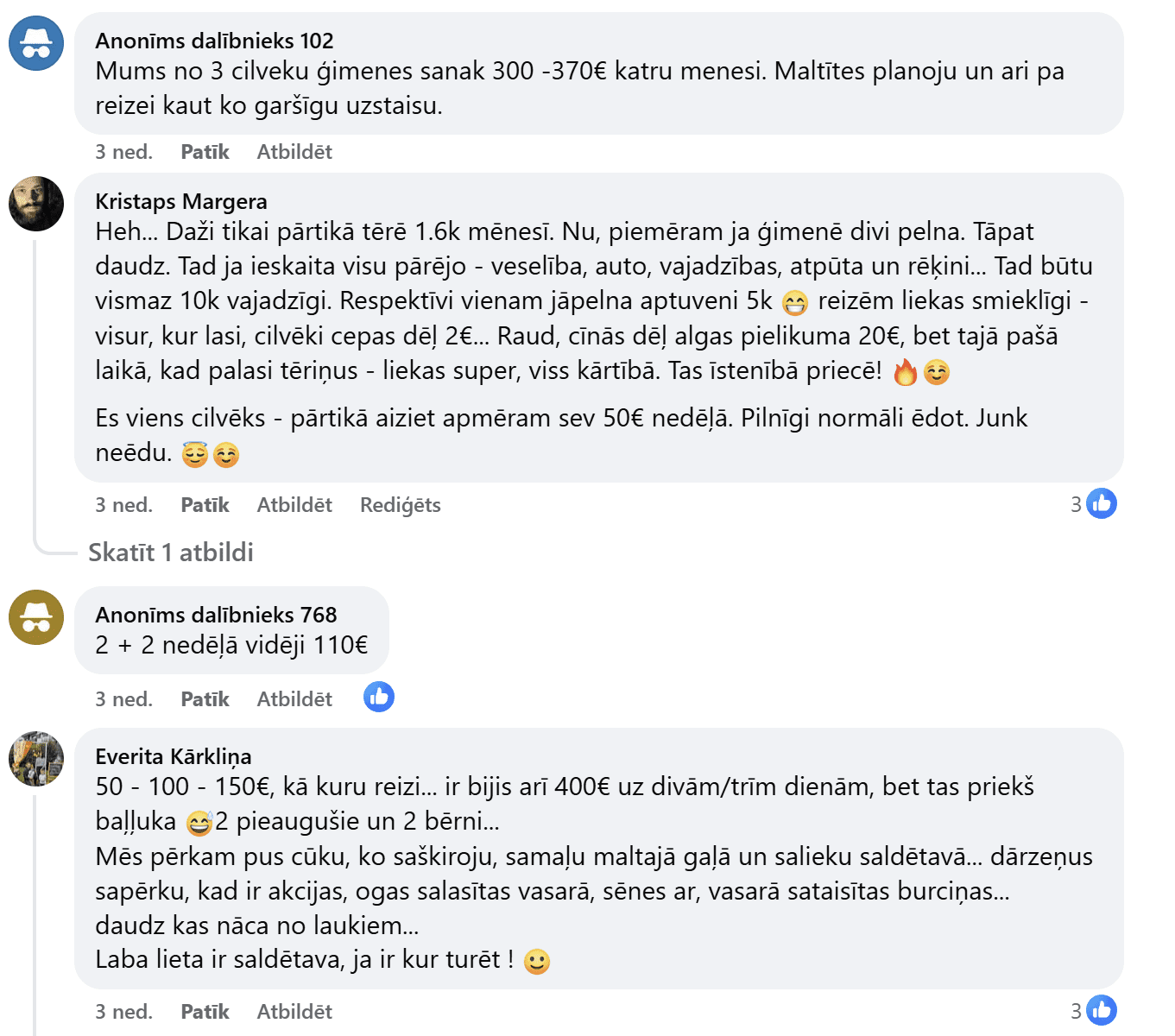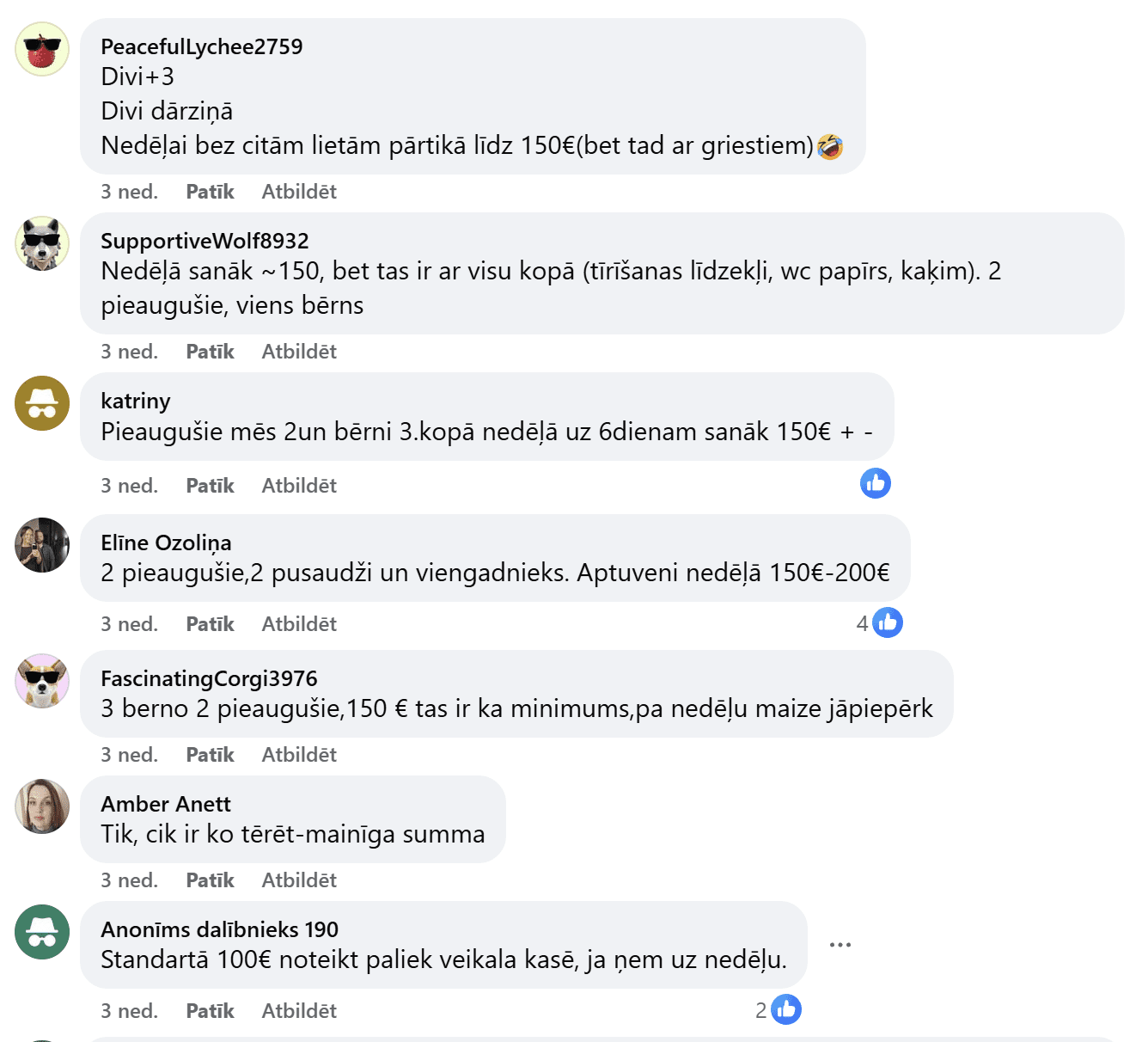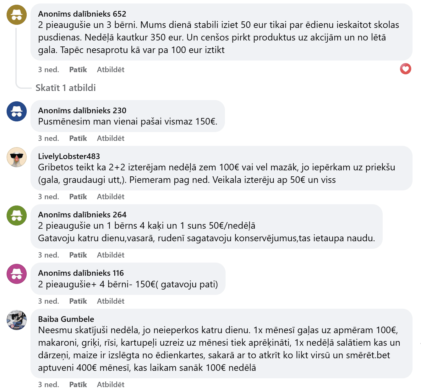Dita norāda: “Ap 70 eiro 2 pieaugušie 1 meita mājās esmu 4x nedēļā tad arī gatavoju, lai var līdzi paņemt uz darbu. Vīrs tikai uzsilda pamatā ir zupas ko ēdam 3-4 dienas. Neko baigi ekstra netaisām griķi, rīsi, makaroni ar malto gaļu. Viss pa vienkāršo.”