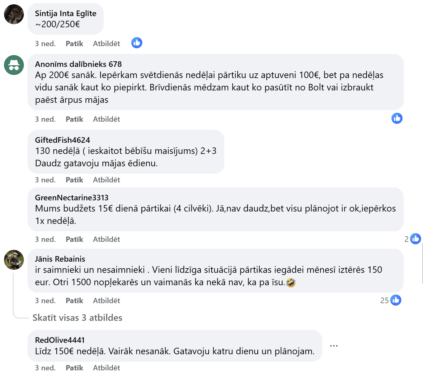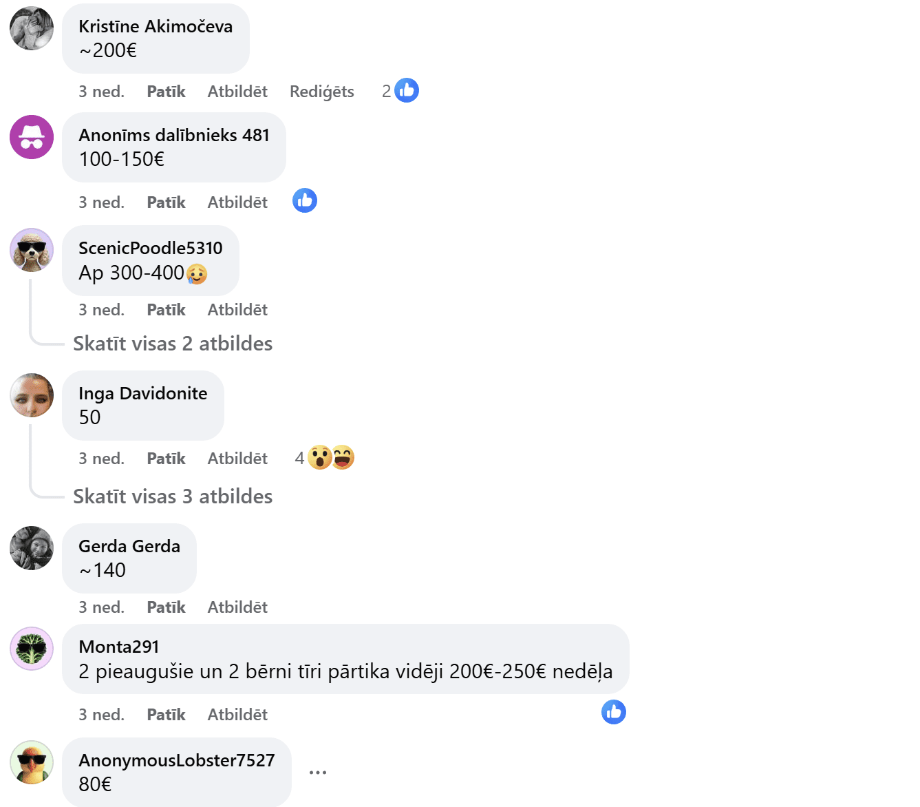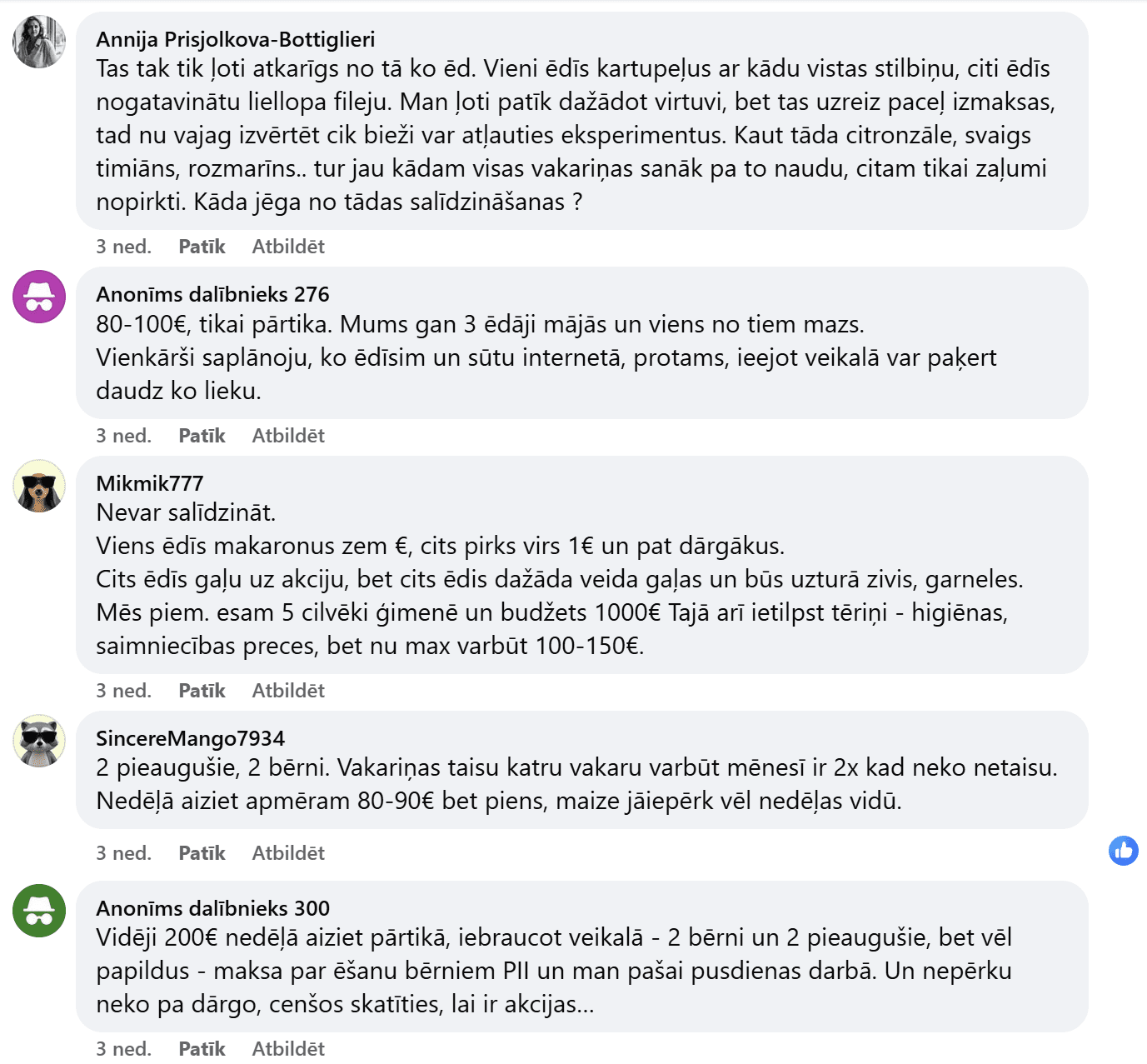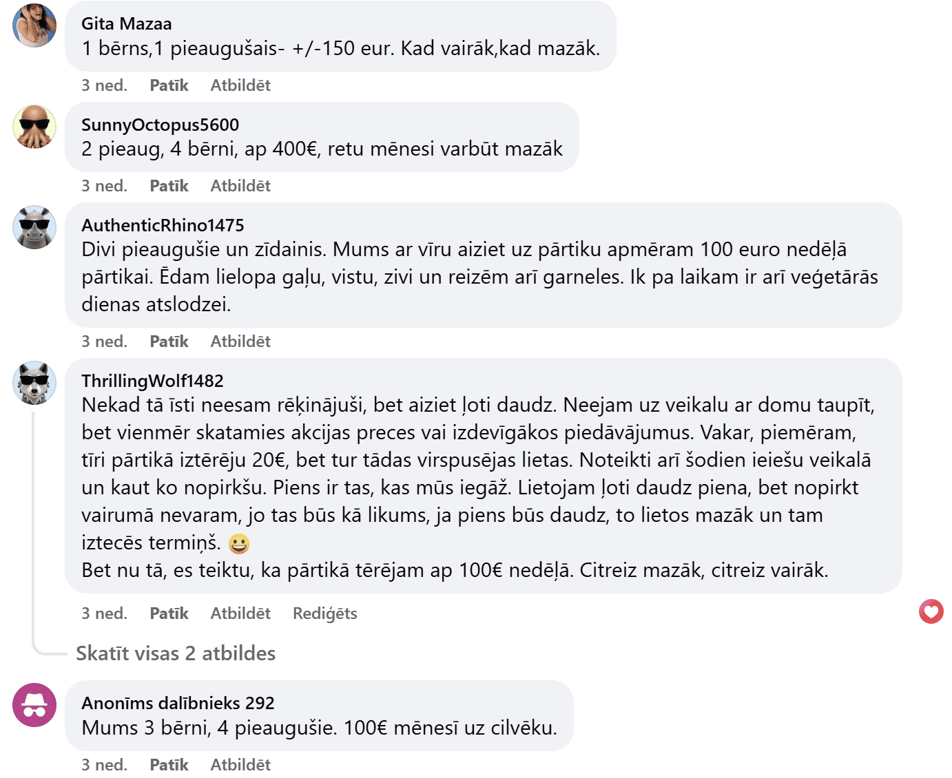 Dita norāda: “Ap 70 eiro 2 pieaugušie 1 meita mājās esmu 4x nedēļā tad arī gatavoju, lai var līdzi paņemt uz darbu. Vīrs tikai uzsilda pamatā ir zupas ko ēdam 3-4 dienas. Neko baigi ekstra netaisām griķi, rīsi, makaroni ar malto gaļu. Viss pa vienkāršo.”