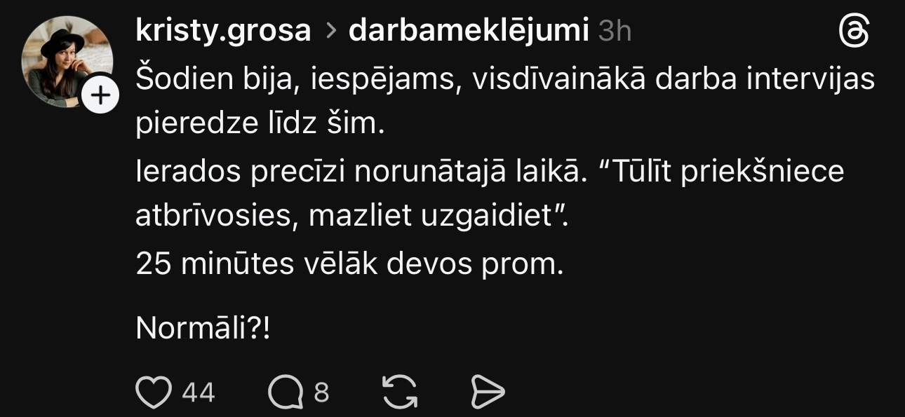 Savāds atgadījums noticis ar Kristīni, kura ar stāstu dalījusies platformā “Threads”. Viņa ieradusies uz darba interviju, bet topošais darba devējs ilgi kavējis. “Šodien bija, iespējams, visdīvainākā darba intervijas pieredze līdz šim. Ierados precīzi norunātajā laikā. “Tūlīt priekšniece atbrīvosies, mazliet uzgaidiet.” 25 minūtes vēlāk devos prom. Normāli?!” – stāsta sieviete.