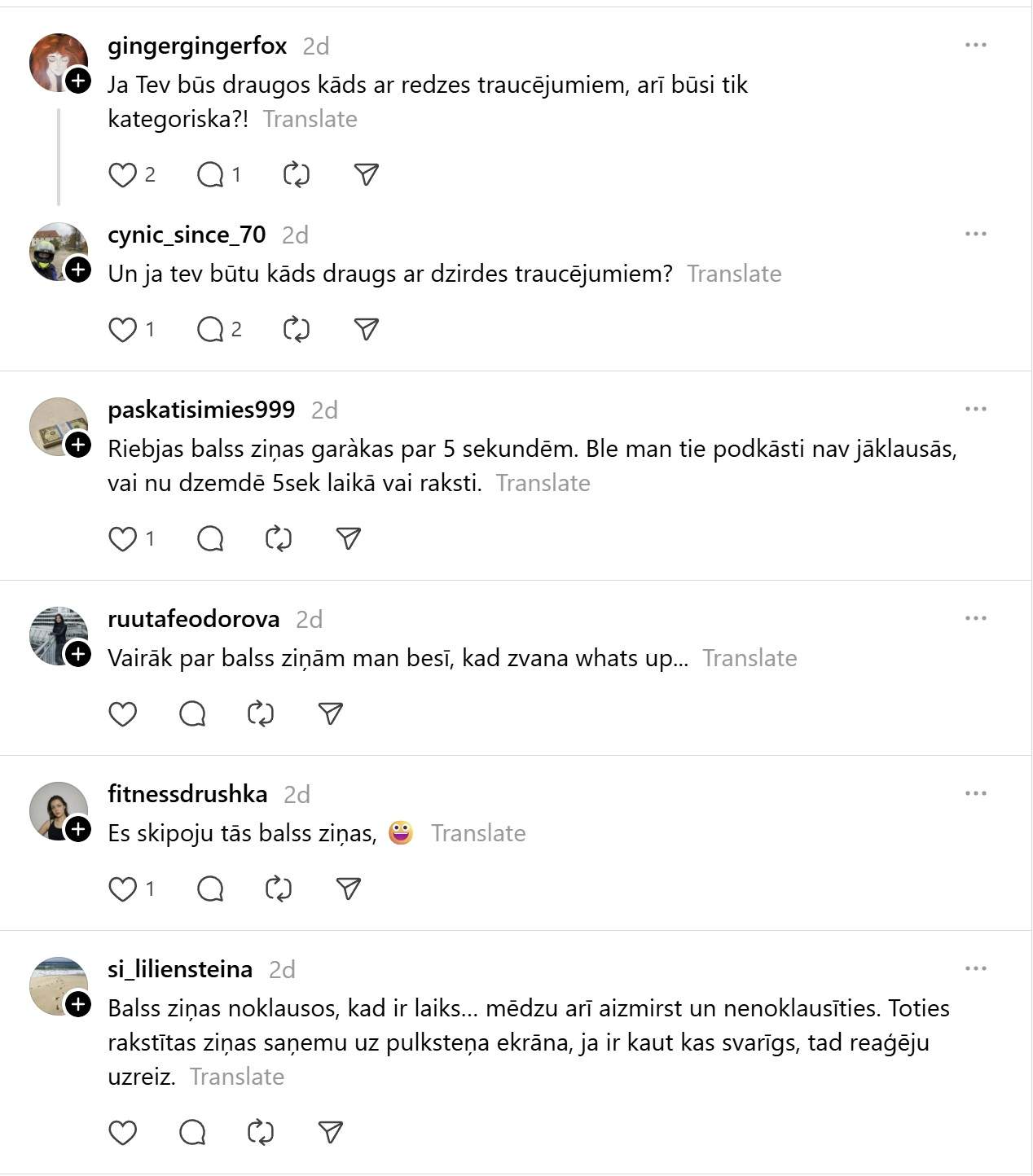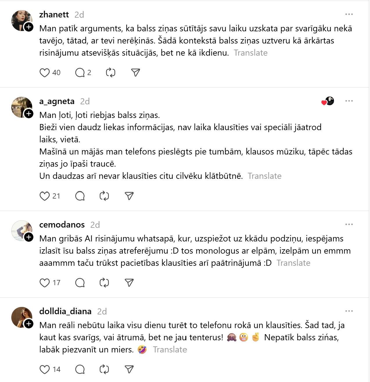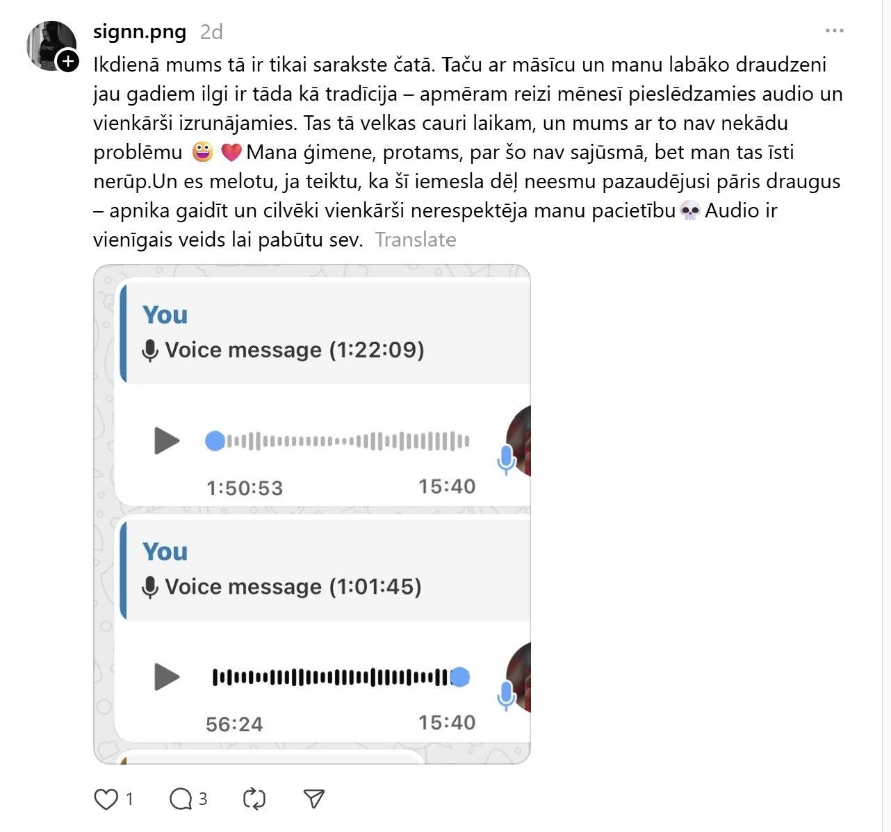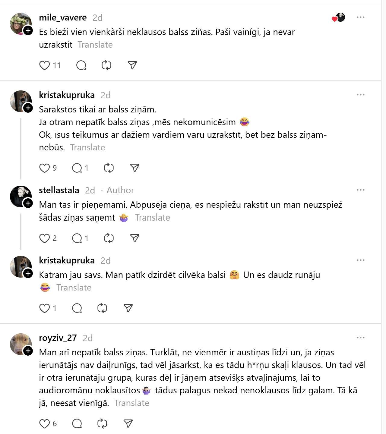 Par to liek aizdomāties arī kāds @stellastala ieraksts soctīklā “Threads”, kur viņa raksta: “Esmu nemoderns cilvēks, kuru tracina balss ziņas. Ok, retu reizi, bet saņemt 50-100 balss ziņas dienā ir ļoti traki. Eeem, aaa un saņēmējs galā izskatās kā pielipis pie telefona. Atskaņot skaļi nevar, klausuli vislaik pie auss turēt arī negribu. Arguments, ka “visi” tā dara, uz mani nestrādā. Ļoti ceru, ka whatapps reiz ieviesīs balss ziņu bloķēšanu atsevišķos čatos, jo vienmēr ir iespēja zvanīt, ja kas svarīgs! Es kukū?”