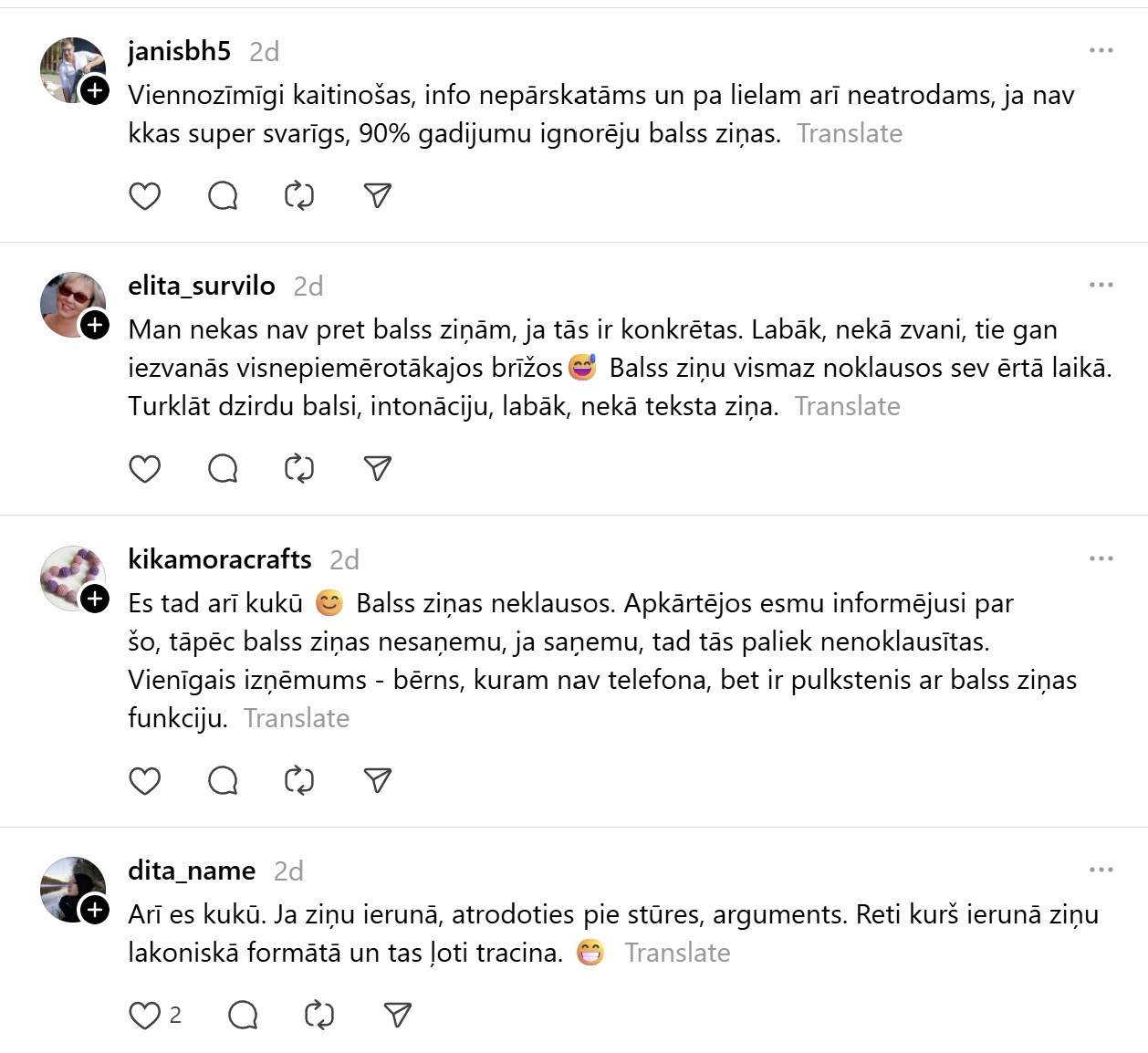 Komentāru pie šī ieraksta ir daudz, jūtams, ka tēma ir aktuāla daudziem, taču komentētāji arī dalās divās grupās – vieni šo uzskata par tiešām ērtu saziņas veidu, bet citus tas tracina.