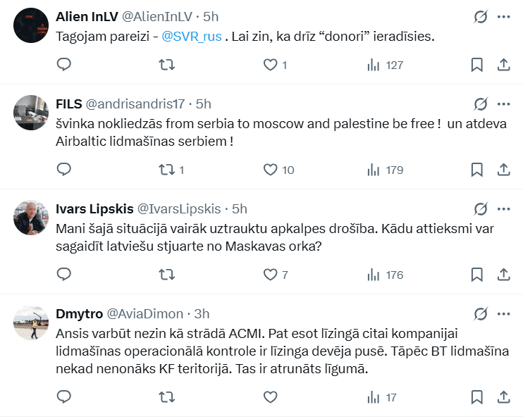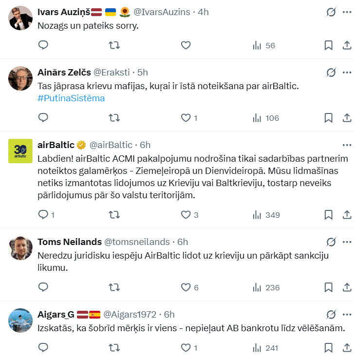 Vienlaikus “airBaltic” platformā “X” norāda, ka aviokompānija pilna servisa nomas pakalpojumu (ACMI) nodrošina tikai sadarbības partnerim noteiktos galamērķos – Ziemeļeiropā un Dienvideiropā. “Mūsu lidmašīnas netiks izmantotas lidojumos uz Krieviju vai Baltkrieviju, tostarp neveiks pārlidojumus pār šo valstu teritorijām,” teikts paziņojumā.