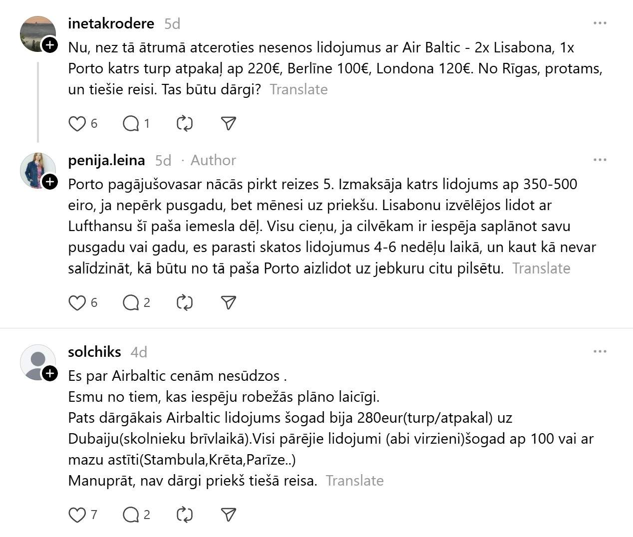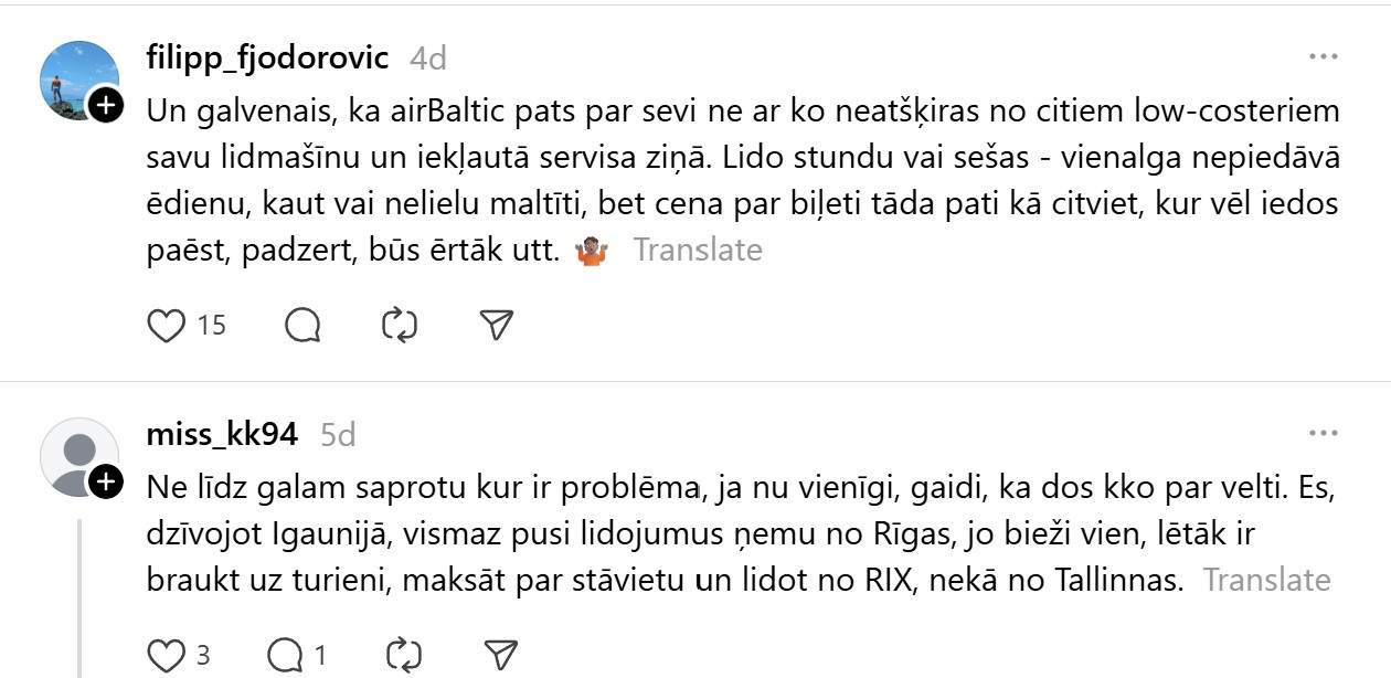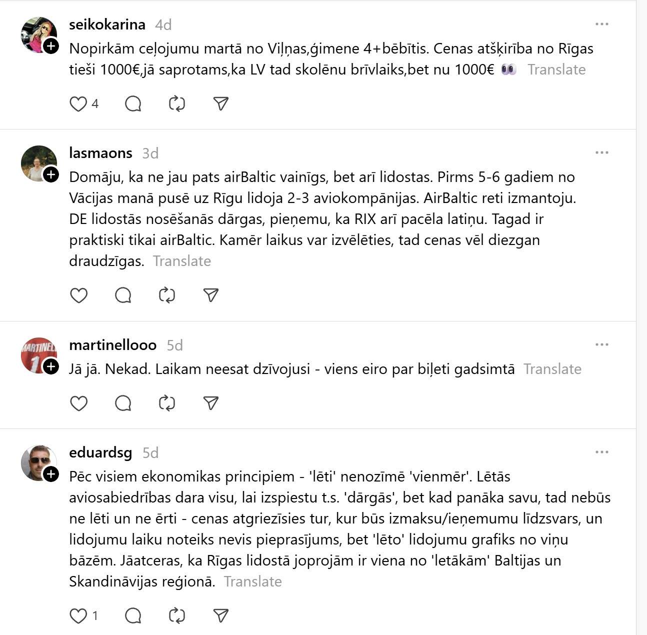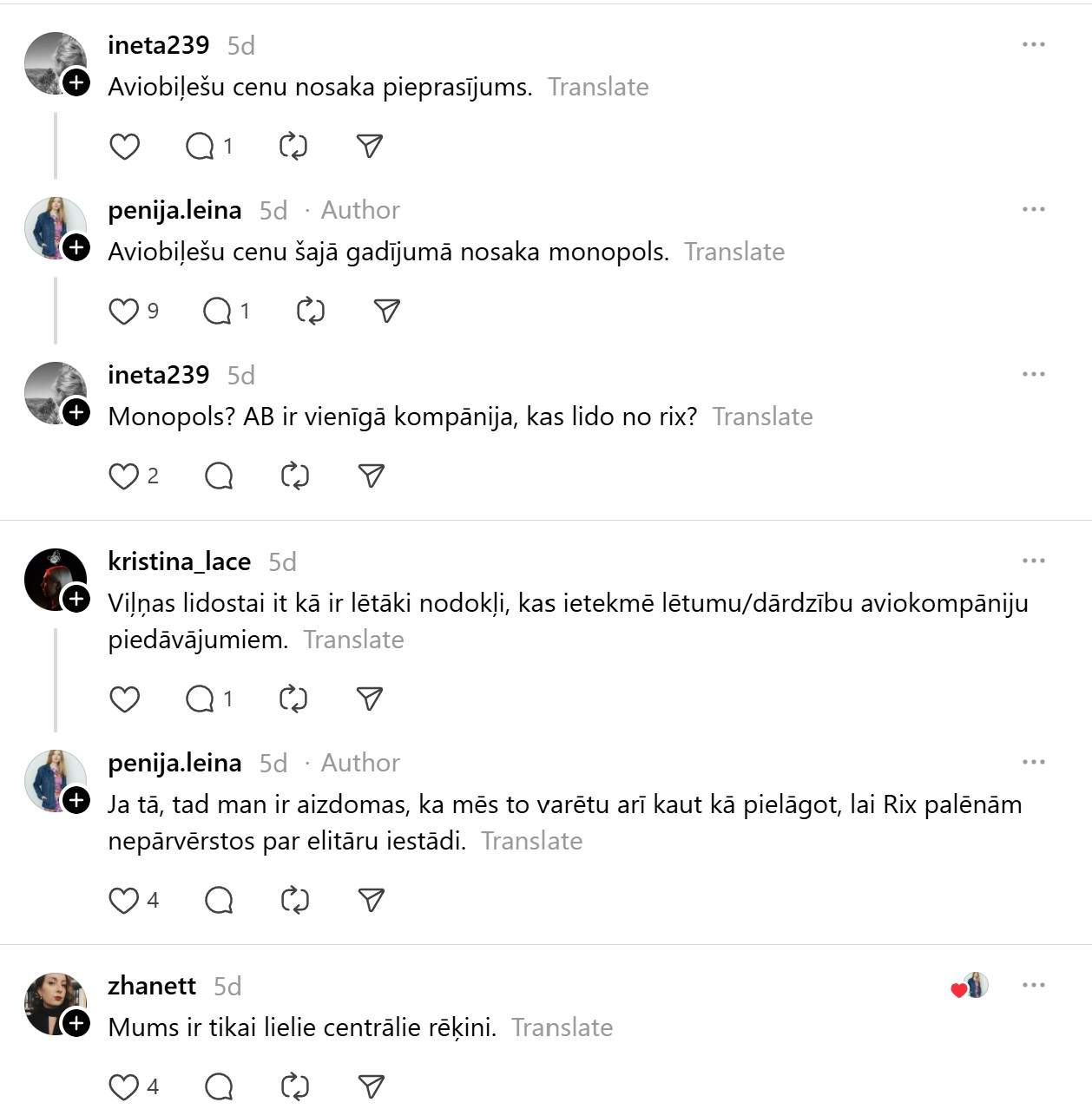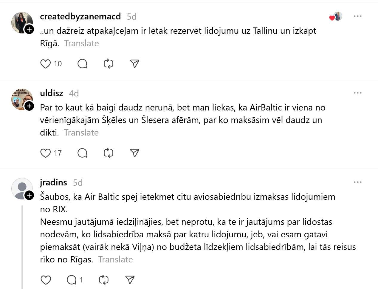 Tā arī visai spraiga diskusija par šo tēmu izvērtusies platformā “Threads”, kur @penija.leina norāda tieši uz šo problēmu: “Mums nekad nav bijuši pieejami daudz lēti lidojumi, bet nu jau liekas, ka airBaltic ir izēdis no tirgus visu – tiklīdz meklēju kādu saprātīgu lidojumu, tas gandrīz vienmēr ir no Viļņas. Bet lielajai centrālajai lidostai taču bija jābūt mums, vai ne? Bet, nē, ir diezgan skaidrs, ka labāk par to pašu naudu pavadīt patīkamu diennakti Viļņā un tad lidot, nemaksājot trīssimts eiro, lai sasniegtu salīdzinoši tuvu Eiropas pilsētu.