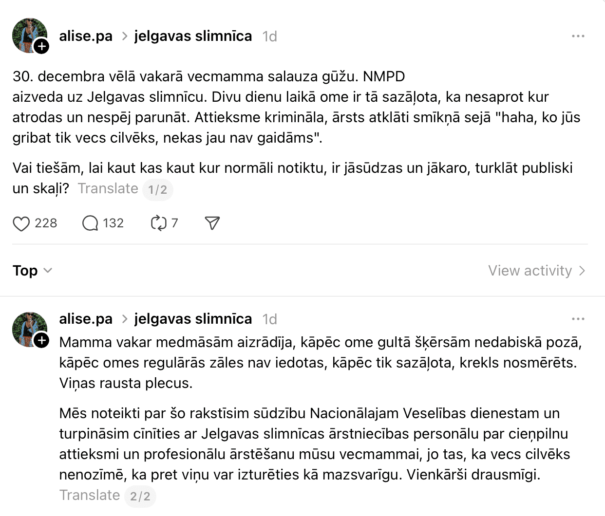 Mēs noteikti par šo rakstīsim sūdzību Nacionālajam veselības dienestam un turpināsim cīnīties ar Jelgavas slimnīcas ārstniecības personālu par cieņpilnu attieksmi un profesionālu ārstēšanu mūsu vecmammai, jo tas, ka cilvēks ir vecs, nenozīmē, ka pret viņu var izturēties kā pret mazsvarīgu. Vienkārši drausmīgi,” vietnē “Threads” dalās Alise.
