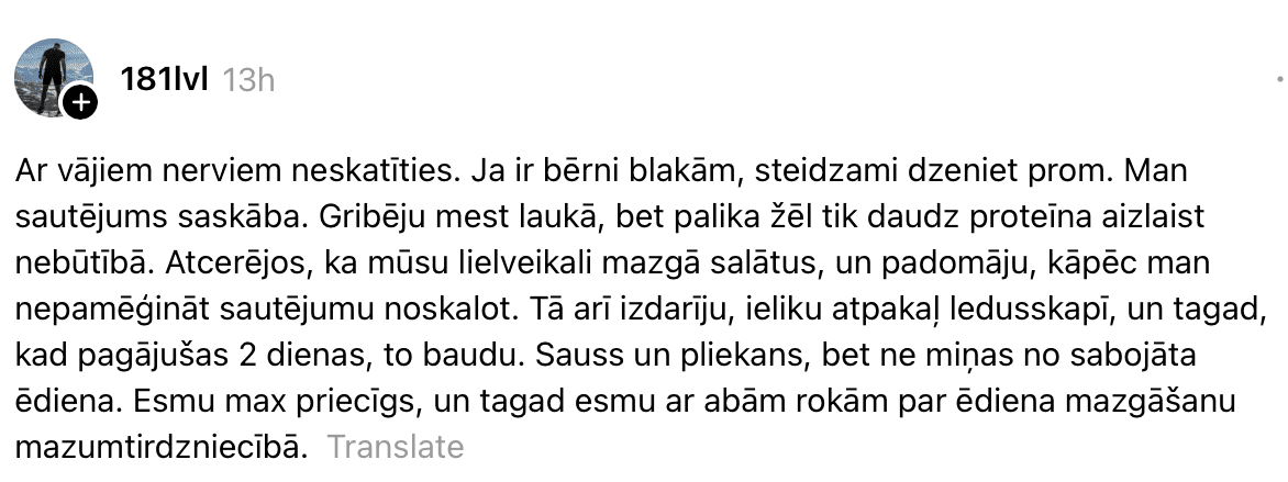 Vīrietis ar segvārdu Env (@181lvl) platformā “Threads” dalās pieredzē: “Ar vājiem nerviem neskatīties. Ja ir bērni blakām, steidzami dzeniet prom. Man sautējums saskāba. Gribēju mest laukā, bet palika žēl tik daudz proteīna aizlaist nebūtībā. Atcerējos, ka mūsu lielveikali mazgā salātus, un padomāju – kāpēc man nepamēģināt sautējumu noskalot. Tā arī izdarīju, ieliku atpakaļ ledusskapī, un tagad, kad pagājušas 2 dienas, to baudu.”
