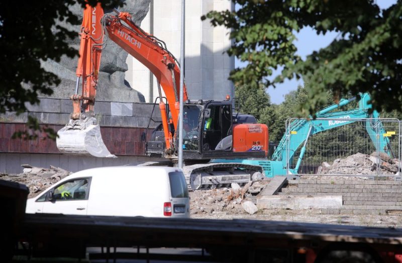 Lielā tehnika darbojas, demontējot pieminekļa postamentu. Tāpat demontāžas darbus teritorijā veic arī mazāka tehnika. Objekta teritorija vienlaikus tiek atbrīvota no būvgružiem.