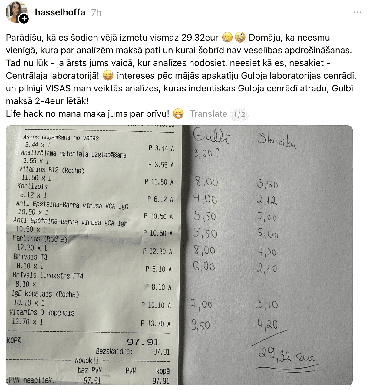“Parādīšu, kā es šodien vējā izmetu vismaz 29,32 EUR. Domāju, ka neesmu vienīgā, kura par analīzēm maksā pati un kurai šobrīd nav veselības apdrošināšanas. Tad nu, lūk, ja ārsts jums vaicā, kur analīzes nodosiet, neesiet kā es, nesakiet: “Centrālajā laboratorijā!” Intereses pēc mājās apskatīju Gulbja laboratorijas cenrādi, un pilnīgi VISAS man veiktās analīzes, kuras identiskas atradu Gulbja cenrādī, Gulbī maksā par 2–4 EUR lētāk! Padoms no mana maka jums par brīvu!” vietnē “Threads” dalās Ieva.