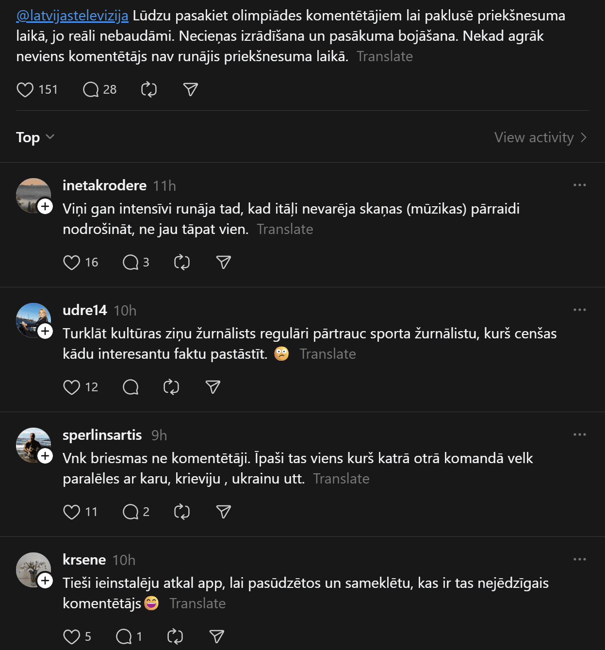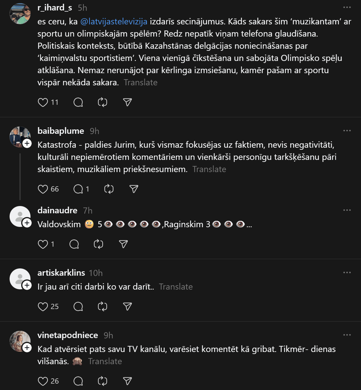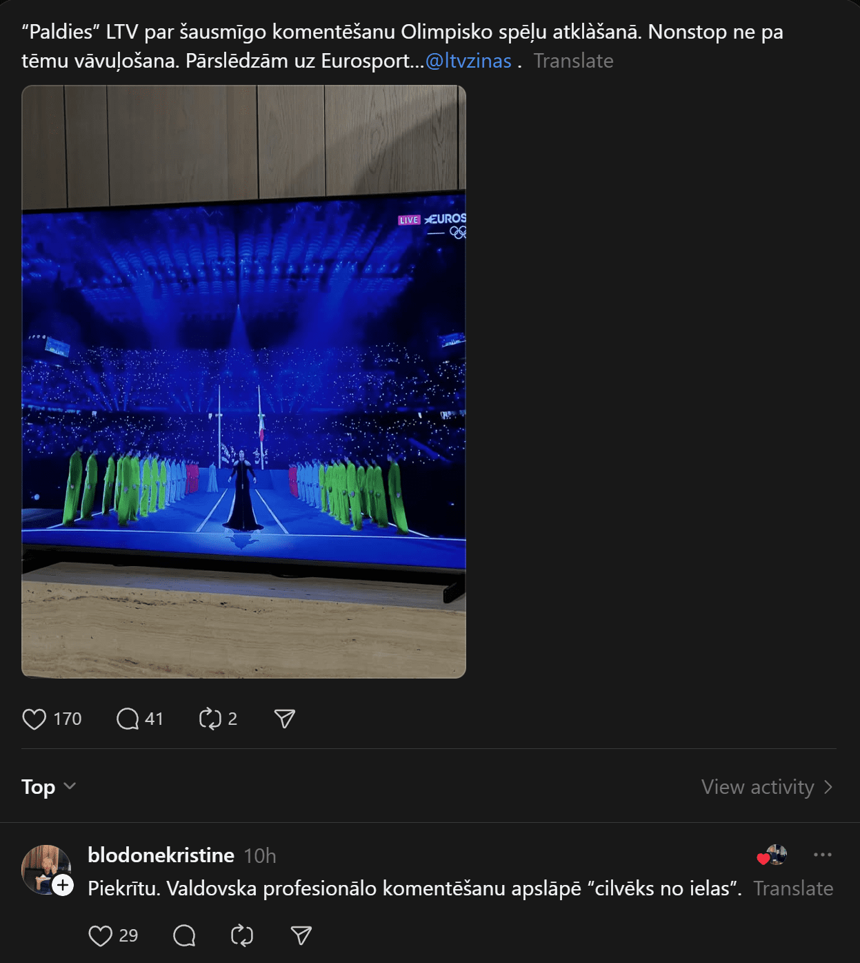 Tomēr šo skaisto brīdi daudziem šķiet pabojājuši vietējie olimpiādes komentētāji LTV. Soctīklos bija lasāma liela šūmēšanās, ka komentāru atklāšanas ceremonijas laikā bijis par daudz un citi pat pārslēguši citu sporta kanālu.