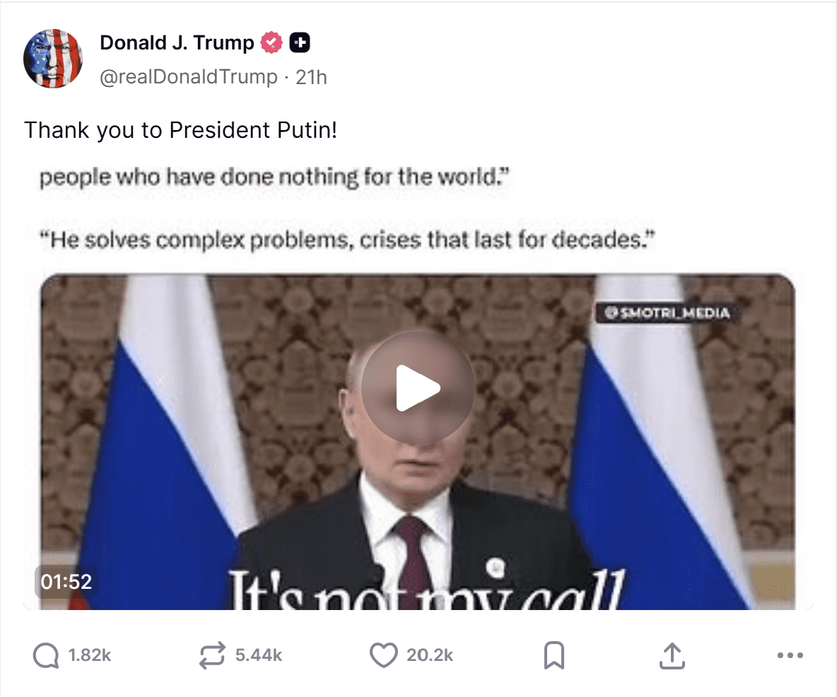Trampam šie izteikumi acīmredzami gāja pie sirds – viņš video ar Putina runu ievietoja savā sociālā tīkla “Truth Social” profilā, pievienojot īsu komentāru: “Paldies, prezident Putin!”