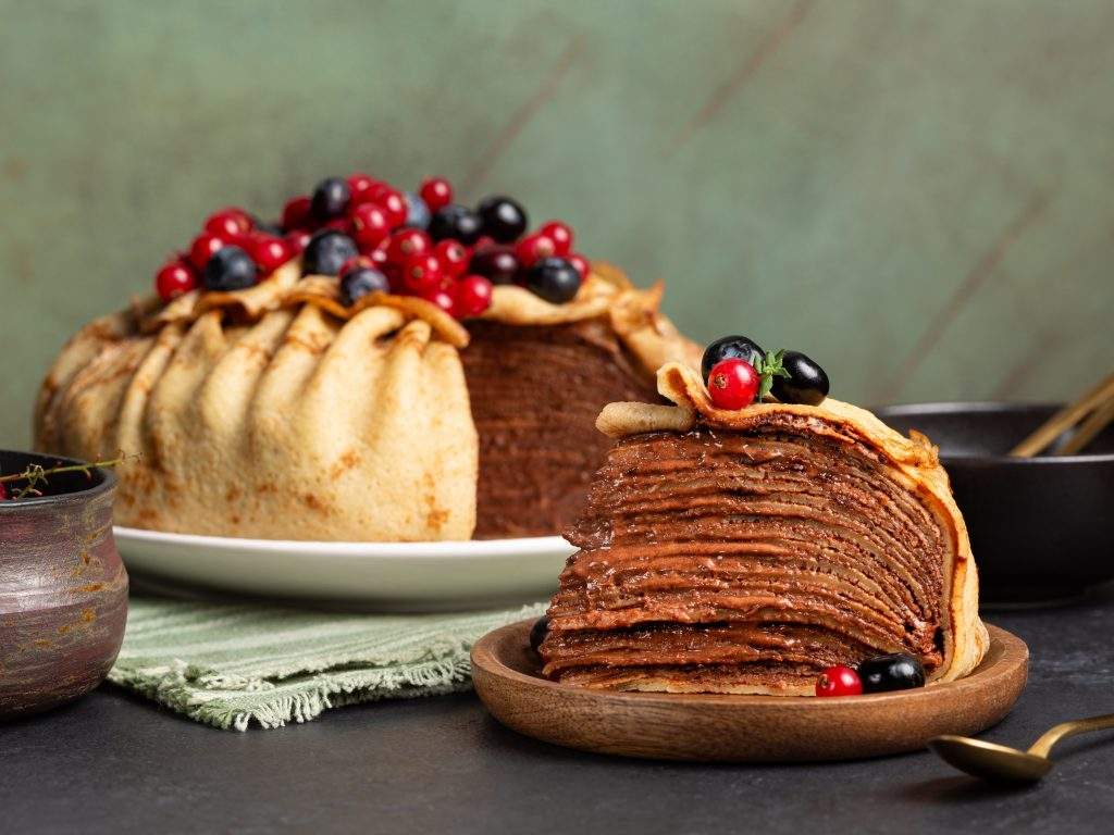 Ja parastās pankūkas šķiet pārāk vienkāršas, laiks tās pārvērst iespaidīgā kūkā. Maigas pankūku kārtas, krēmīgs biezpiena pildījums, tumšās šokolādes gabaliņi, grauzdētas mandeles un atsvaidzinoša dzērveņu nots – šis deserts izskatās svinīgi, bet ir pārsteidzoši viegli pagatavojams.