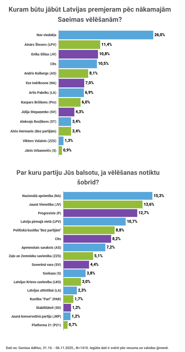 Starptautiskā pētījumu un tehnoloģiju uzņēmuma “Gemius” veiktā aptauja atklāj, ka lielāko atbalstu premjerministra kanditātu vidū iegūst Ainārs Šlesers, kam seko Evika Siliņa, bet vairākumam aptaujāto nav viedokļa, vai izvēlētos kādu citu kandidātu ārpus tiem, kas ir uz šo brīdi izvirzīti. No politiskajām partijām populārākās ir Nacionālā Apvienība, Jaunā Vienotība un Progresīvie.