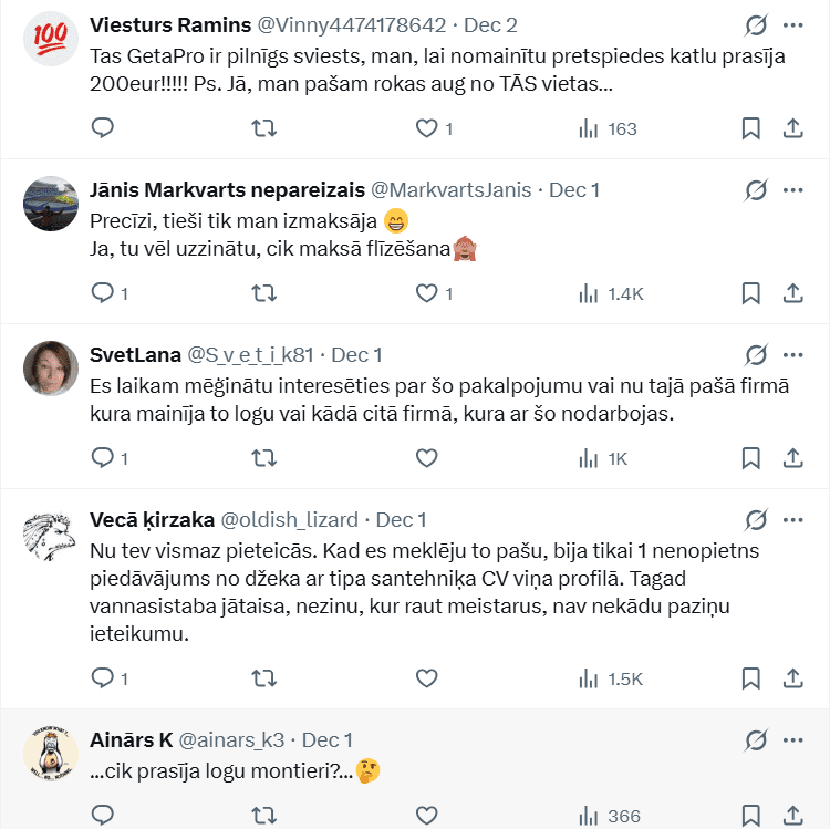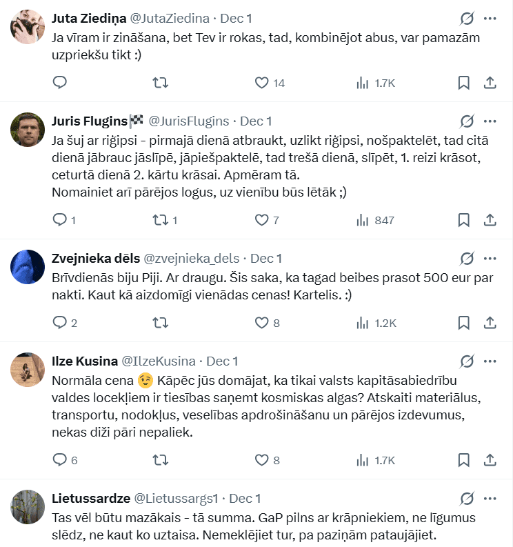 Viņa X raksta: “Esmu pilnīgi “uz pauzes”. Dzīvoklī nomainījām virtuves logu. Vajadzētu apdarināt loga aili. Ieliku GetaPro jautājumu. Vienas loga ailes apdares cena no 500 eiro!!! Cik man ir jāpelna, lai varētu atļauties? Nolaidu ausis. Vīram rokas neklausa. Gan līdz vasarai paši kaut kā.”