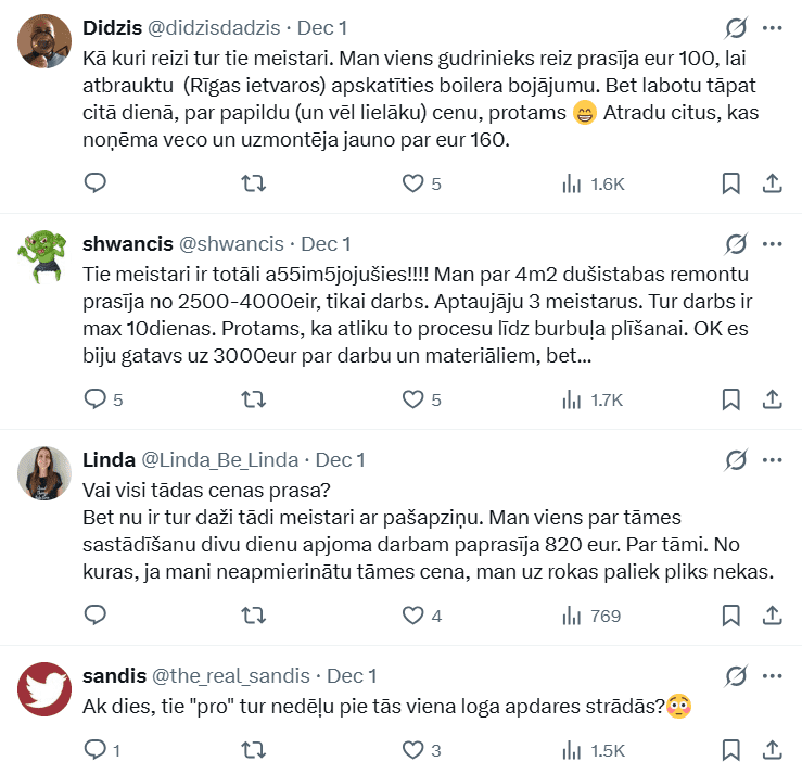 Ko Mārcis man atbildēja? Vai 800 eiro par trepju demontāžu ir adekvāta cena? Vai 100 eiro stundā par dēļu tīrīšanu nav tā kā par daudz? Vai tiešām meistari stāsta, ka darba veikšanai būs nepieciešama nedēļa un tas izmaksās 1000 eiro, patiesībā to paveic divās, trīs stundās un vienlaicīgi strādā šādi 10 objektos? Mūsu, pakalpojumu ņēmēju, viedokļu un novērojumu ir daudz, bet tagad laiks uzklausīt nozares pārstāvi, diplomētu celtnieku Mārci.