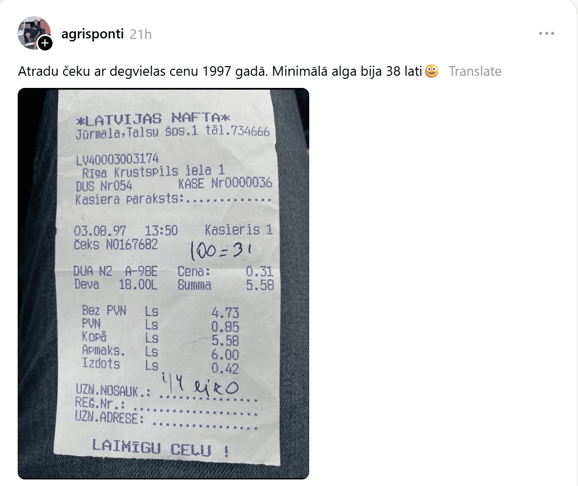 Viņš raksta: “Atradu čeku ar degvielas cenu 1997. gadā. Minimālā alga bija 38 lati.” Tajā redzams, ka 18 litri degvielas maksāja vien 5,58 latus, kas nozīmē, ka litra cena bija tikai 31 santīms. Toreiz cilvēki ar dažiem latiem varēja pilnībā uzpildīt degvielas bāku – mūsdienās tas šķiet gandrīz vai neticami.