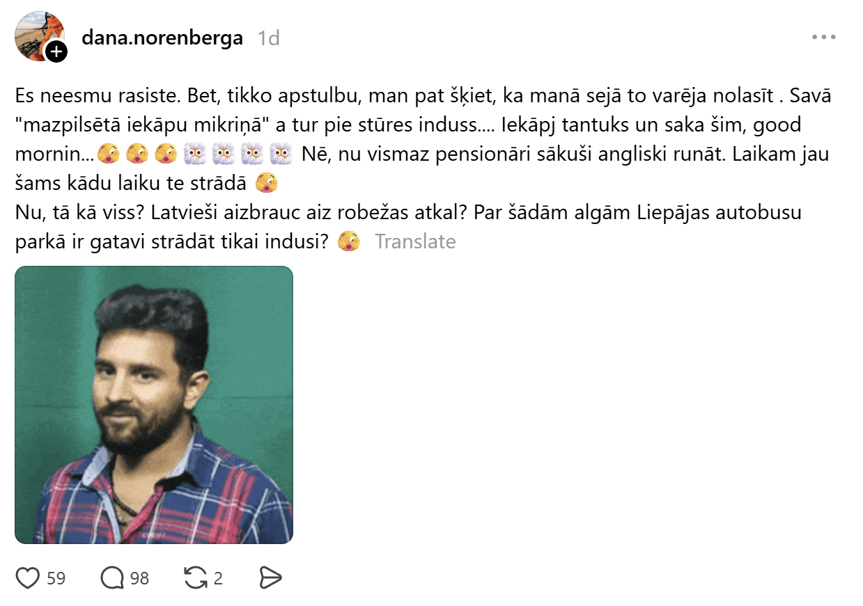 Sieviete raksta: “Es neesmu rasiste. Bet tikko apstulbu, man pat šķiet, ka manā sejā to varēja nolasīt. Savā mazpilsētā iekāpu mikriņā a tur pie stūres induss… Iekāpj tantuks un saka šim: “Good mornin…” Nē, nu vismaz pensionāri sākuši angliski runāt. Laikam jau šams kādu laiku te strādā.