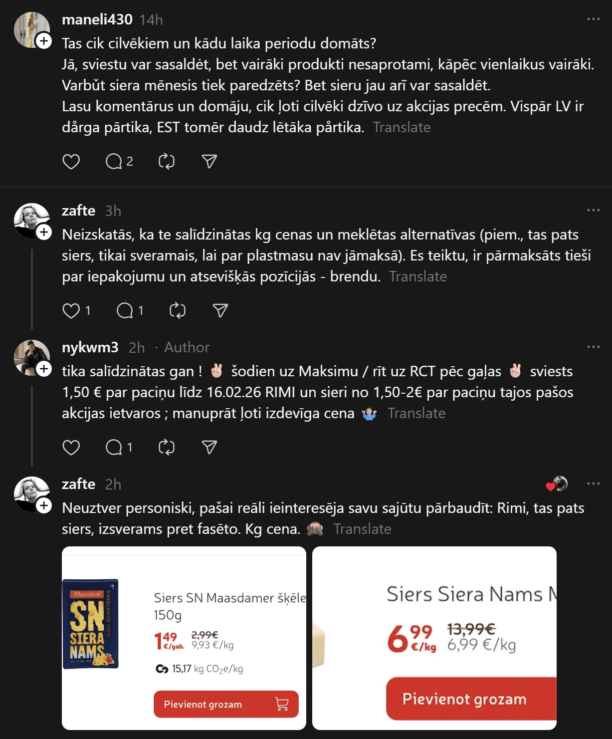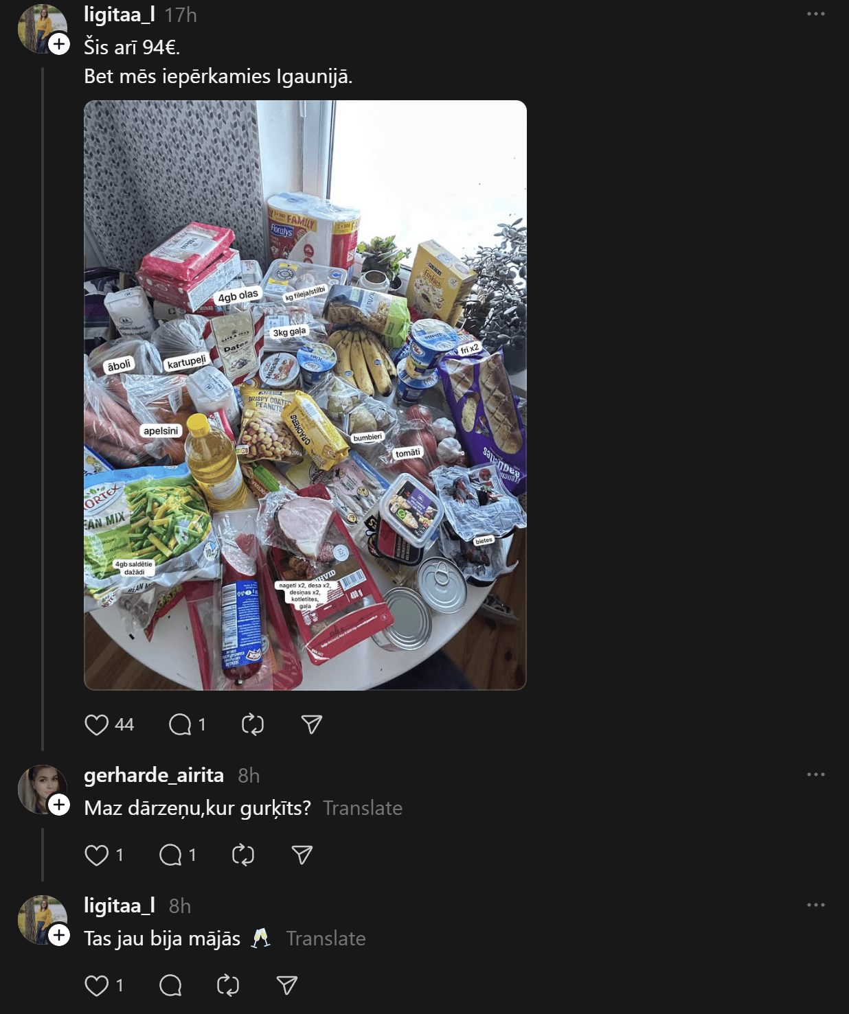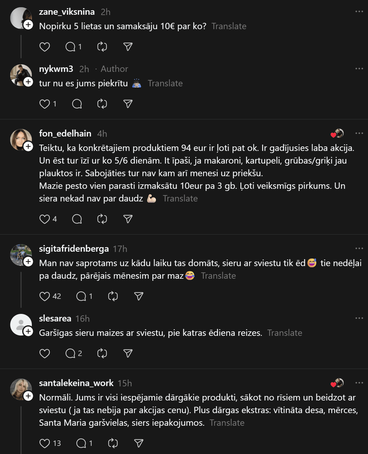 Komentāros daudzi raksta, ka cena par visu iegādāto ir atbilstoši, jo ir vairāki iepakojumi ar sieru, kas ir dārgs. Citi norāda, ka par šādu cenu noteikti var iegādāties veselīgāku pārtiku vai atbilstošāku pamata maltīšu pagatavošanai. Kāda sieviete nofotografējusi savu pārtikas grozu par 94 eiro, ko iegādājies Igaunijā. Kurš iepircies veiksmīgāk?