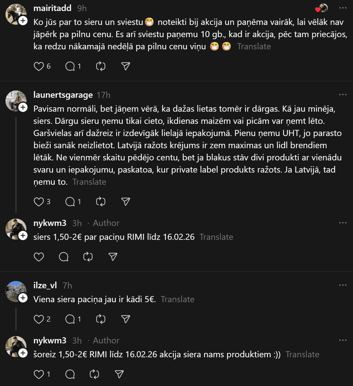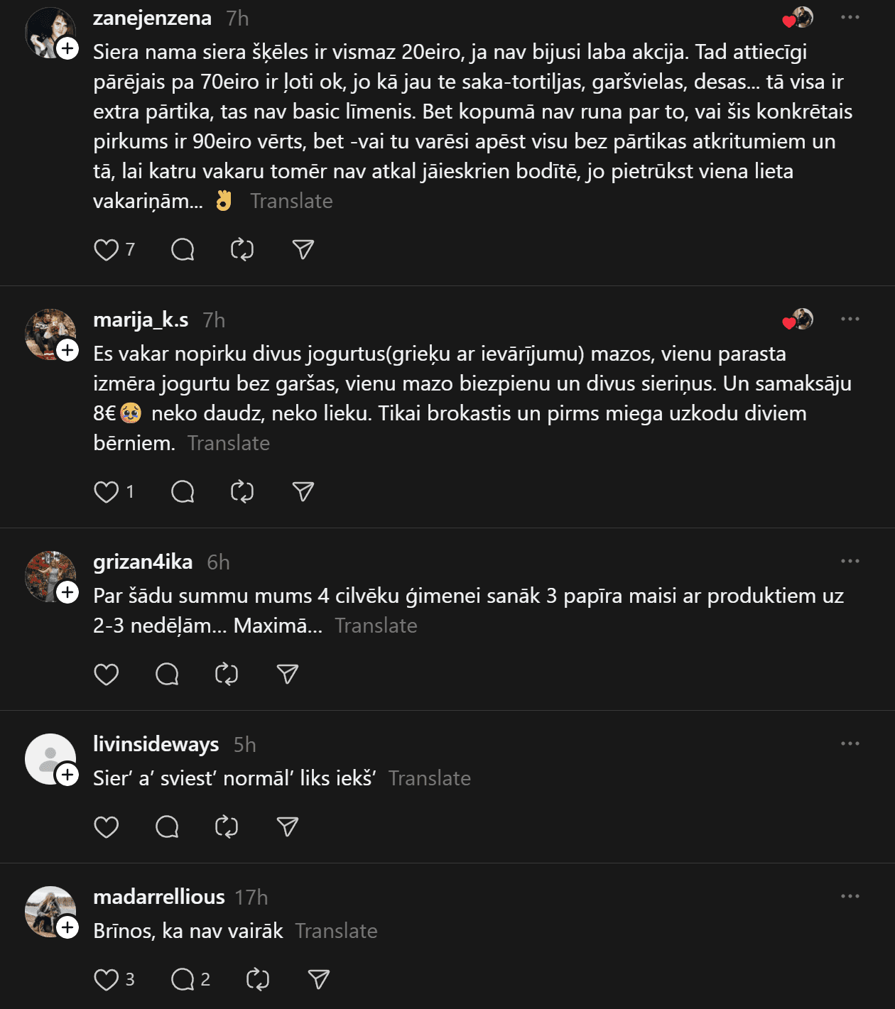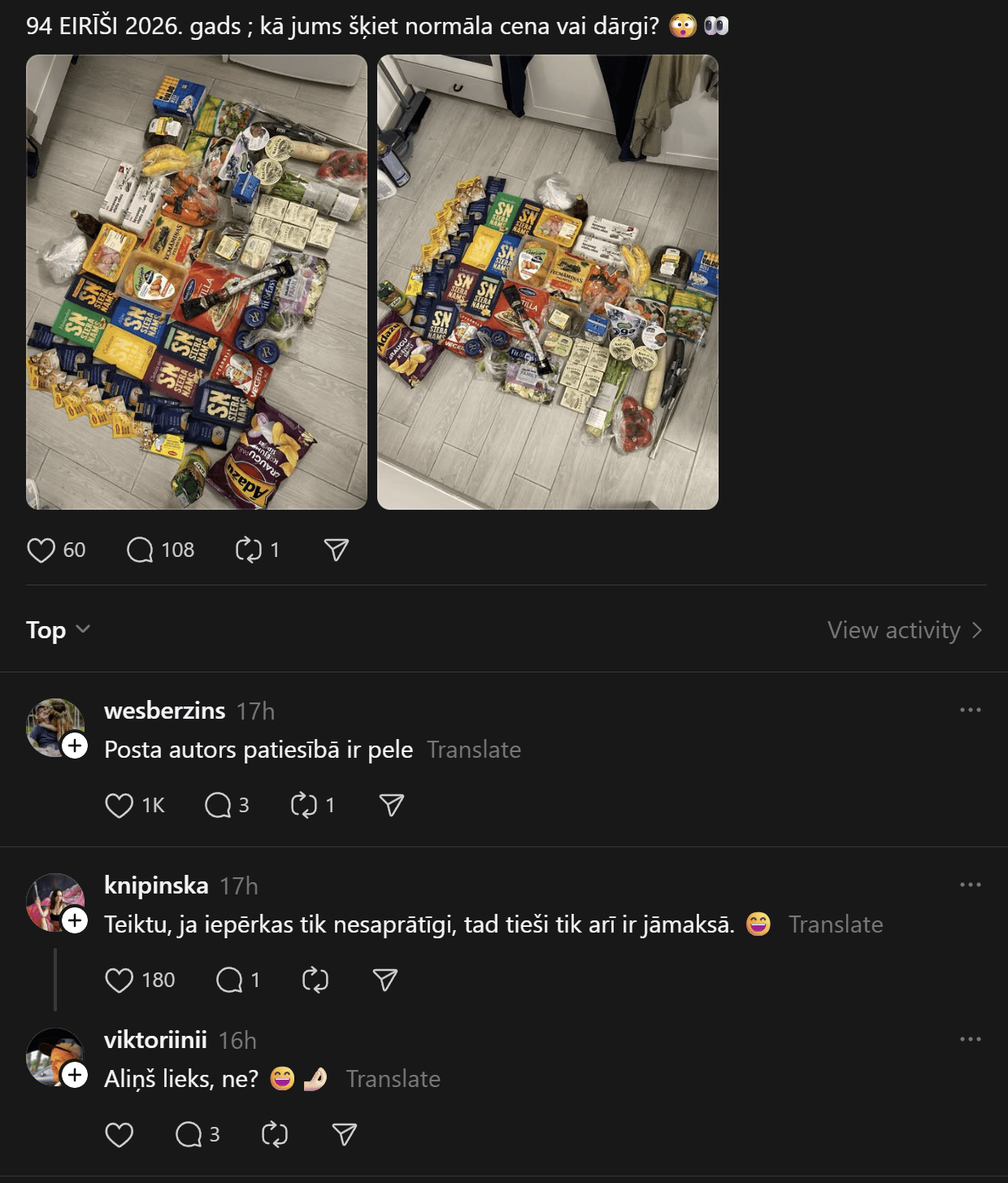 Komentāros daudzi raksta, ka cena par visu iegādāto ir atbilstoši, jo ir vairāki iepakojumi ar sieru, kas ir dārgs. Citi norāda, ka par šādu cenu noteikti var iegādāties veselīgāku pārtiku vai atbilstošāku pamata maltīšu pagatavošanai. Kāda sieviete nofotografējusi savu pārtikas grozu par 94 eiro, ko iegādājies Igaunijā. Kurš iepircies veiksmīgāk?