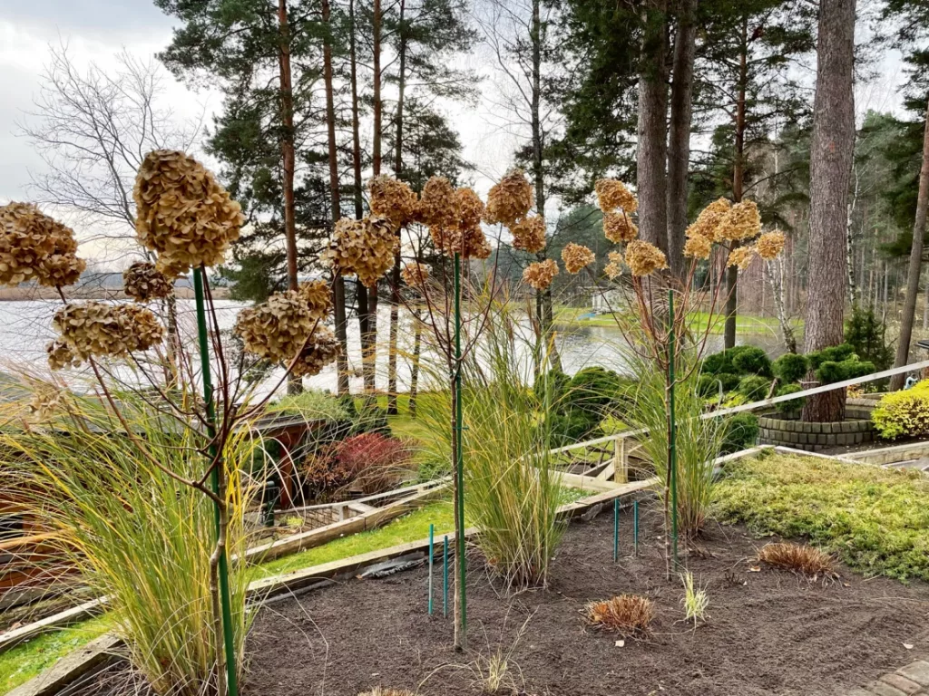 Patlaban novembrī lielākā daļa hortenziju ir zaudējušas savu ziedu krāsu, tie ir izkaltuši un nobrūnējuši. Jāatzīst, ka arī šādi tie dažādo dārza ainavu, tas gan var būt arī tāds patikšanas jautājums. Kamēr viens priecājas par sarmas skartajām ziedkopām, kas izskatās kā apcukurotas, cits pukojas par vecajiem ziediem.