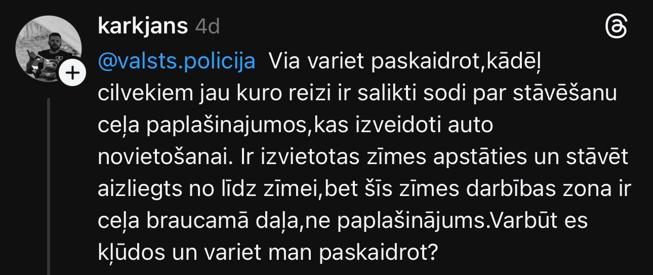 Platformā “Threads” situāciju apraksta Jānis. Viņš uzrunā Valsts policiju: “Valsts policija, vai varat paskaidrot, kādēļ cilvekiem jau kuro reizi ir salikti sodi par stāvēšanu ceļa paplašinājumos, kas izveidoti auto novietošanai? Ir izvietotas zīmes “apstāties un stāvēt aizliegts” no un līdz zīmei, bet šīs zīmes darbības zona ir ceļa braucamā daļa, ne paplašinājums. Varbūt es kļūdos un varat man paskaidrot?