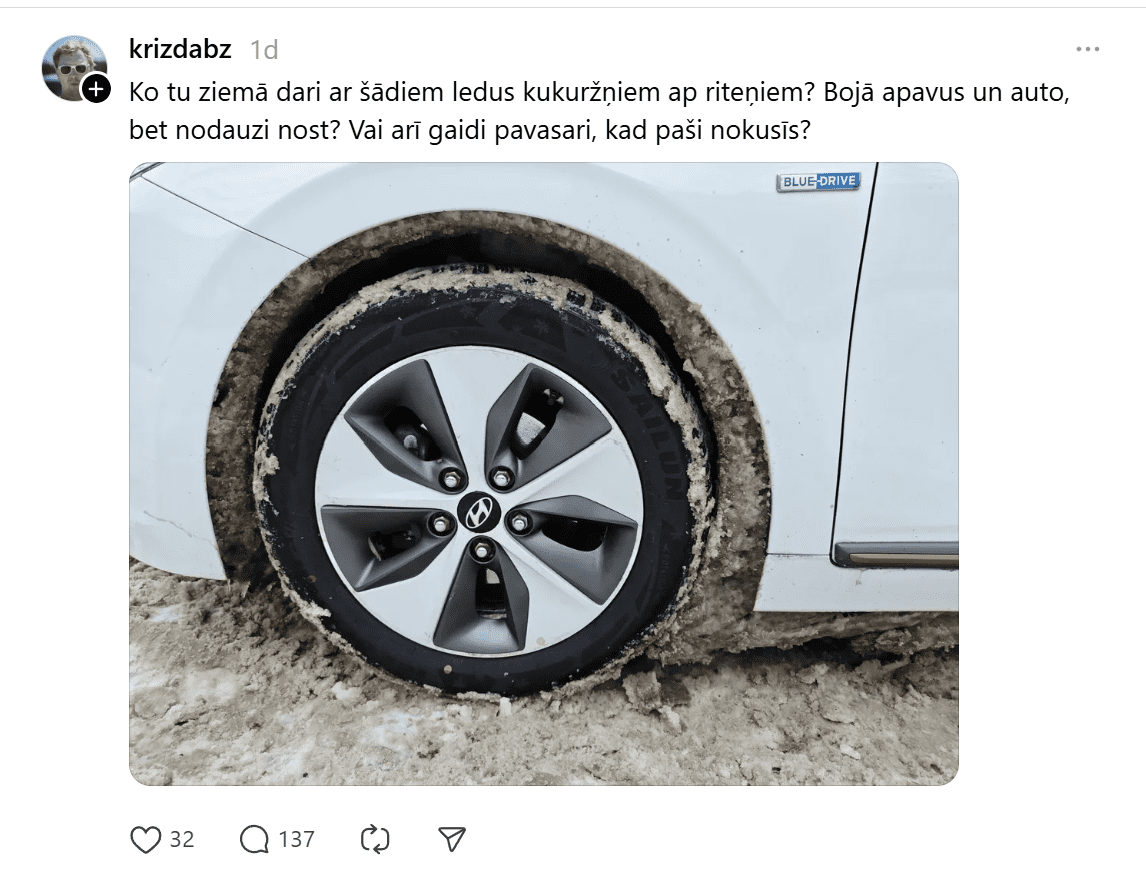 Ziemas apstākļi autovadītājiem Latvijā sagādā ne vien slidenus ceļus, bet arī pavisam ikdienišķas, taču kaitinošas problēmas. Kāds vīrietis sociālajā tīklā “Threads” dalījies ar fotoattēlu, kurā redzami ap automašīnas riteņiem sakrājies sniegs, un uzdevis vienkāršu, bet daudziem ļoti aktuālu jautājumu.