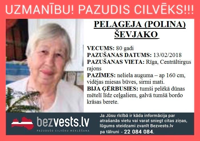Otrdien, 13. februārī, ap plkst. 14. 30 Rīgas Centrāltirgus rajonā pazudusi 80 gadus veca pensionāre Pelageja (Polina) Ševjako, vēsta pazudušo meklēšanas organizācija “Bezvests.lv”.