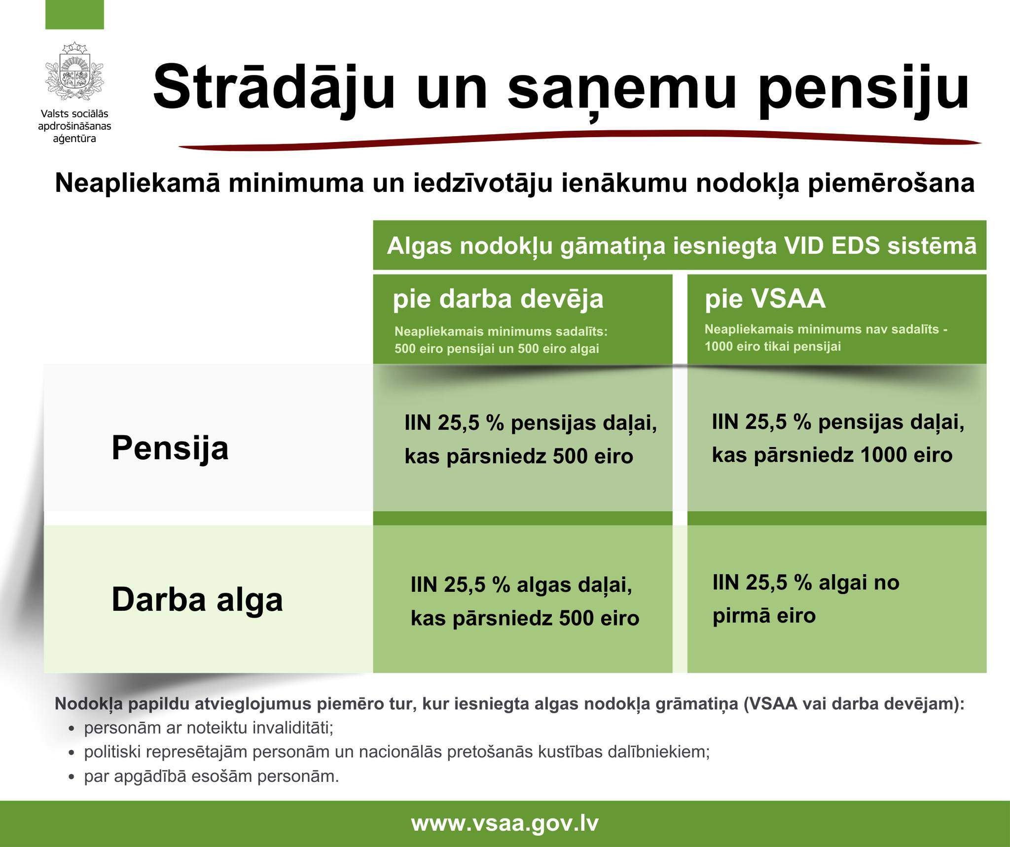 Ja algas nodokļu grāmatiņa ir iesniegta VSAA – pensijai piemēro 1000 eiro neapliekamo minimumu, bet algai ietur IIN no pirmā eiro.