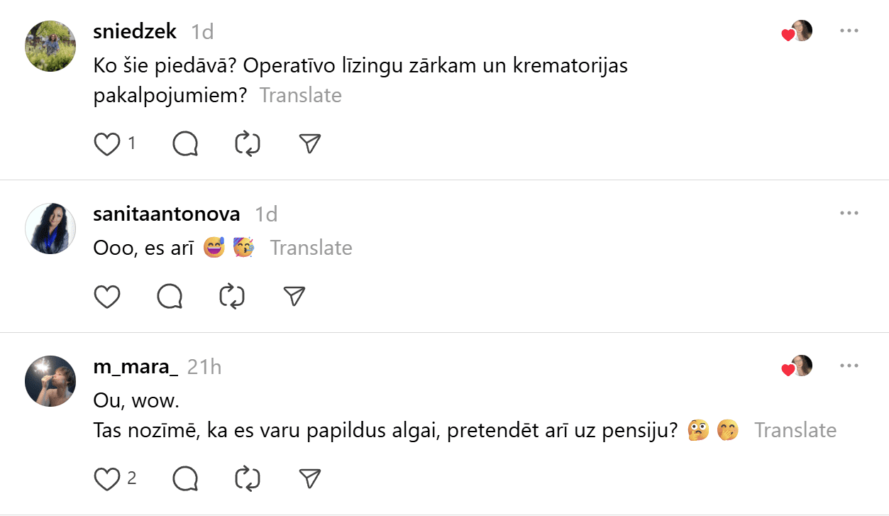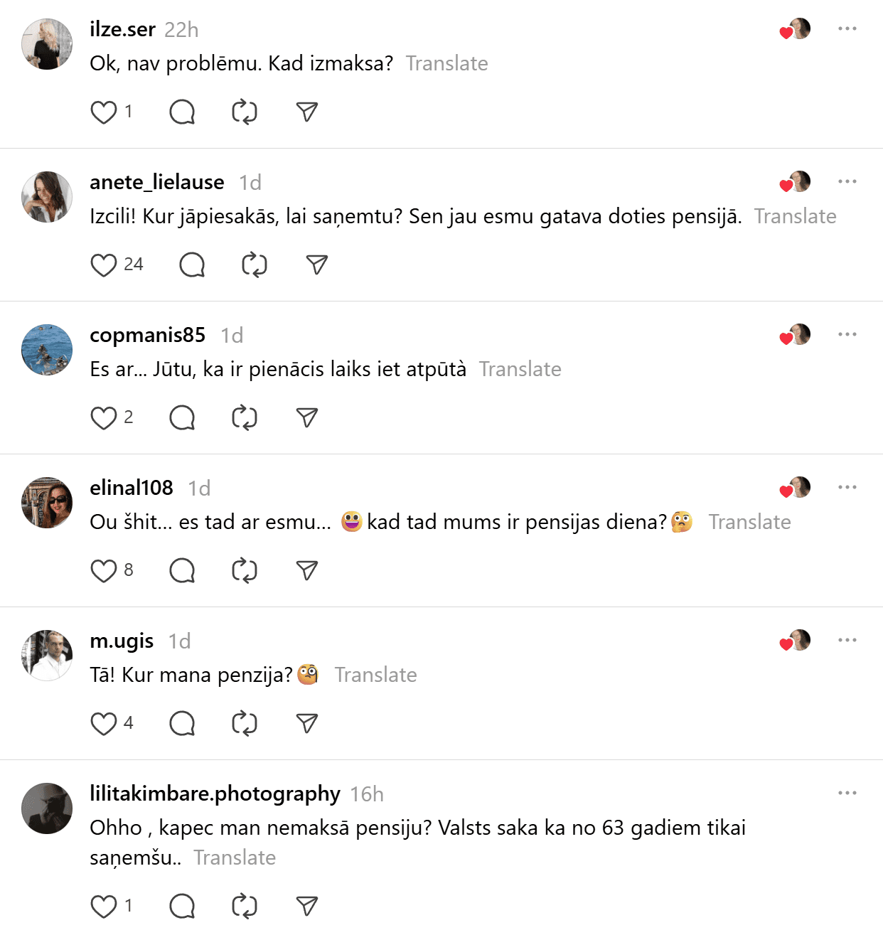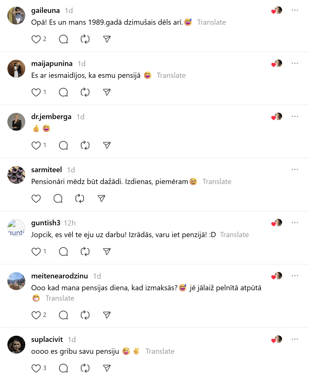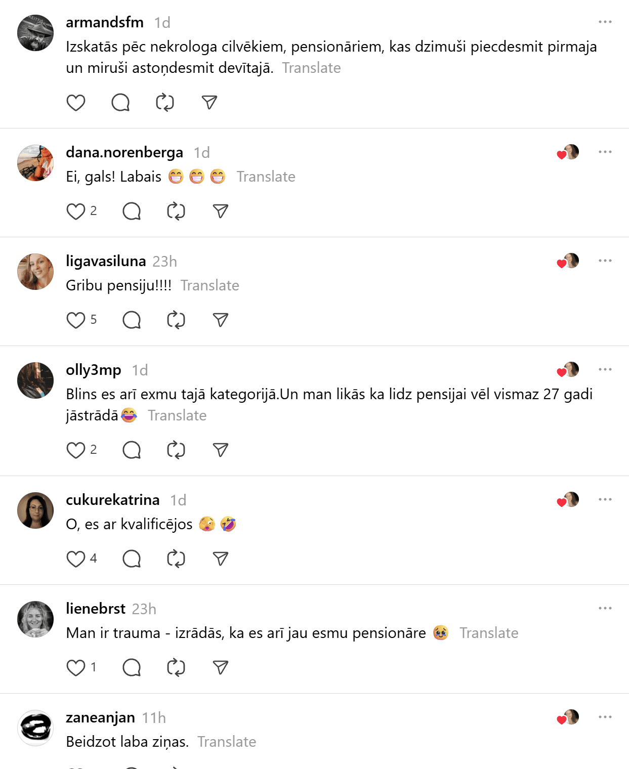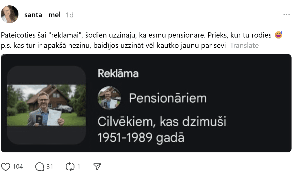 Pēc šīs reklāmas loģikas 36 gadus vecs cilvēks jau tiek uzskatīts par pensionāru… Sociālajā tīklā “Threads” cilvēki šo reklāmu uztver ar humoru. Vairums joko, ka labprāt tiešām saņemtu jau pensiju, neskatoties uz to, ka nebūt vēl nav pensijas vecumā.