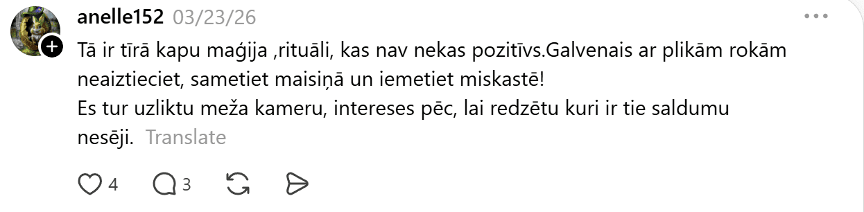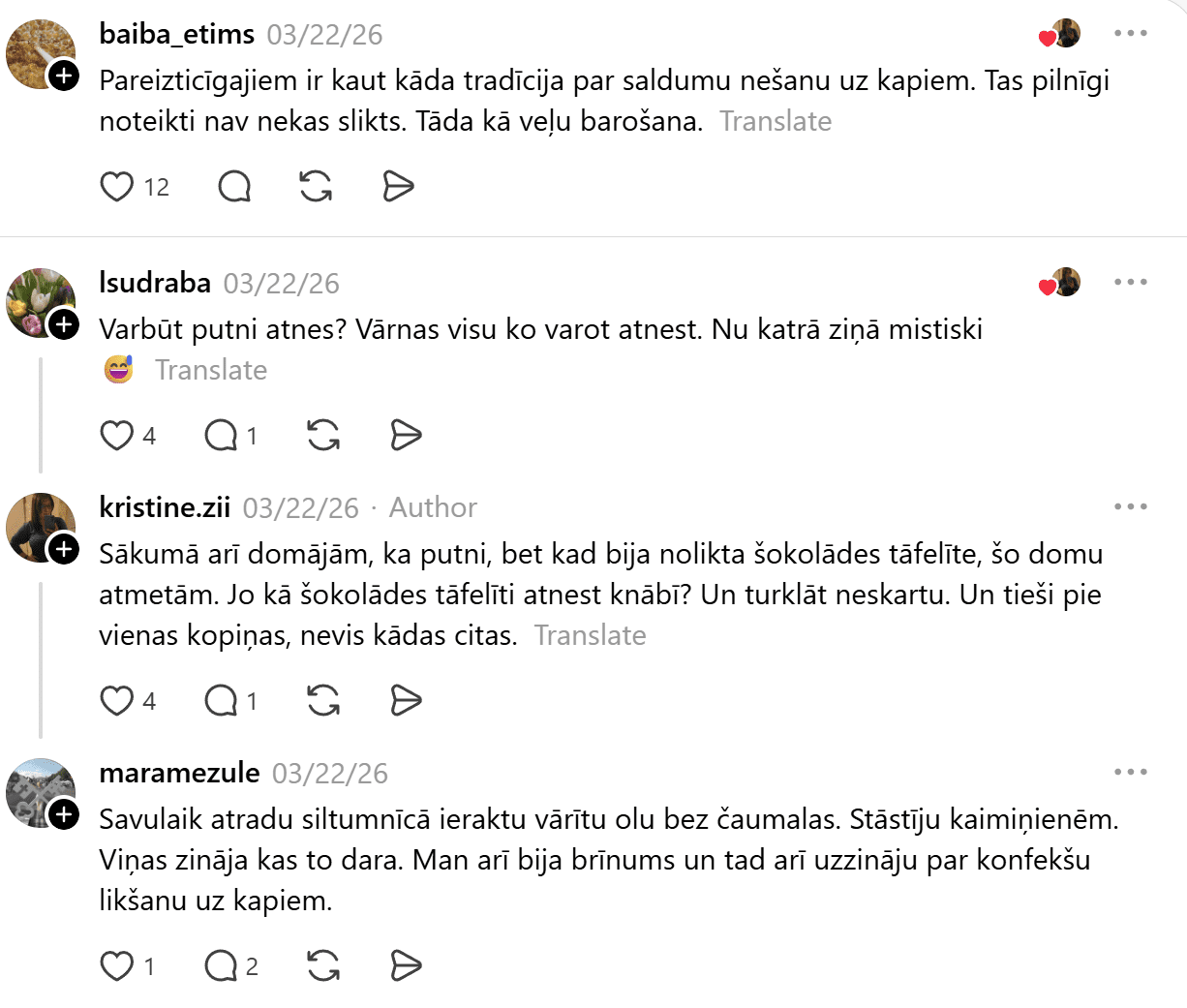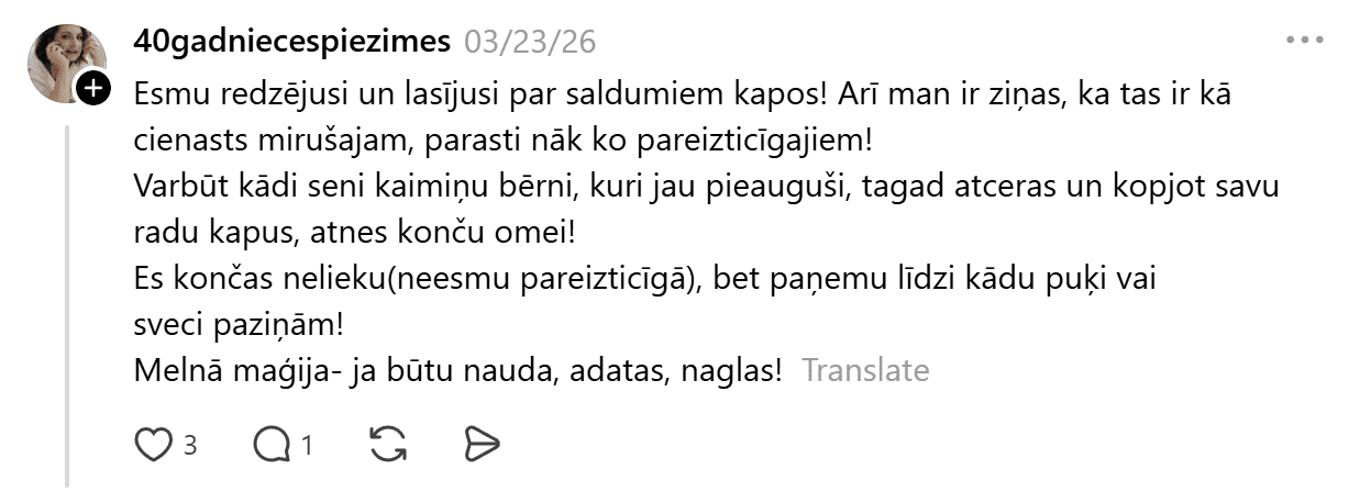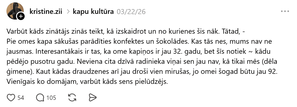 Soctīkla lietotāja vērsusies pie citiem pēc padoma: “Varbūt kāds zinātājs zinās teikt, kā izskaidrot un no kurienes šis nāk. “. Kas tās nes, mums nav ne jausmas. Interesantākais ir tas, ka ome kapiņos ir jau 32. gadu, bet šis notiek kādu pēdējo pusotru gadu. Neviena cita dzīvā radinieka viņai sen jau nav, kā tikai mēs (dēla ģimene). Kaut kādas draudzenes arī jau droši vien mirušas, jo omei šogad būtu jau 92. Vienīgais ko domājam, varbūt kāds sens pielūdzējs.”