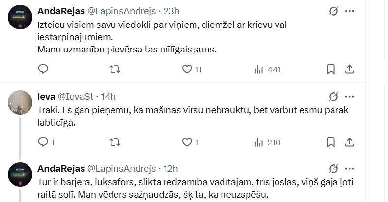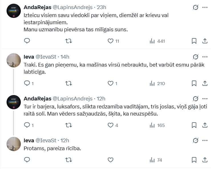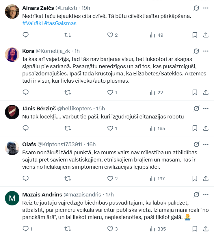 “Novērsu traģēdiju. Apturēju vājredzīgu vai pilnībā aklu cilvēku ar suni-pavadoni. Gāja pāri pie sarkanā Satekles ielai Elizabetes krustā, pirmo daļu pārgāja, ja es nebūtu pieskrējis un apturējis viņu uz saliņas, otru daļu nepārietu. Stāvēja 4-5 “sabiedrības” locekļi un nekā nereaģēja,” viņš X raksta.