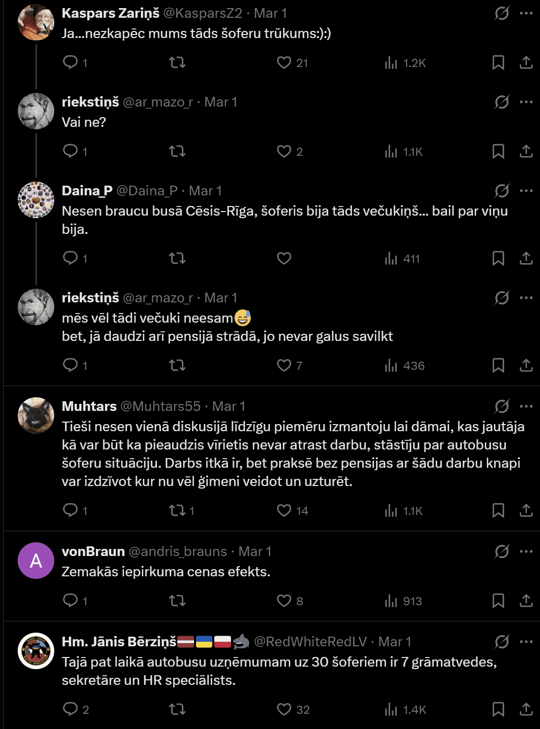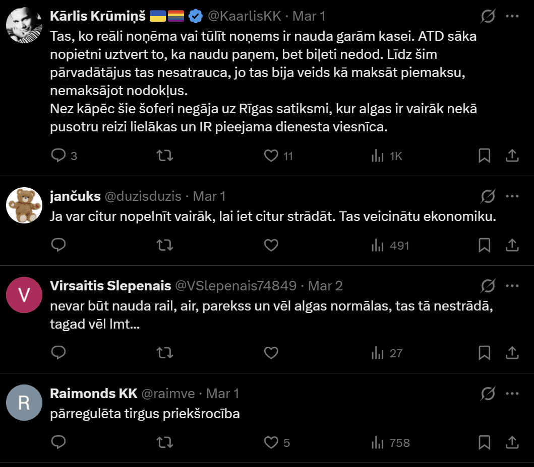 “Parunāju ar čomu no Alūksnes, dzimis autobusa šoferis, visu mūžu strādā un pārvadā pasažierus, patika darbs, bet nu jau paliekot par traku. Noņēma piemaksas, tagad uz papīra 5 eiro/h…izstiepies vai saraujies!”