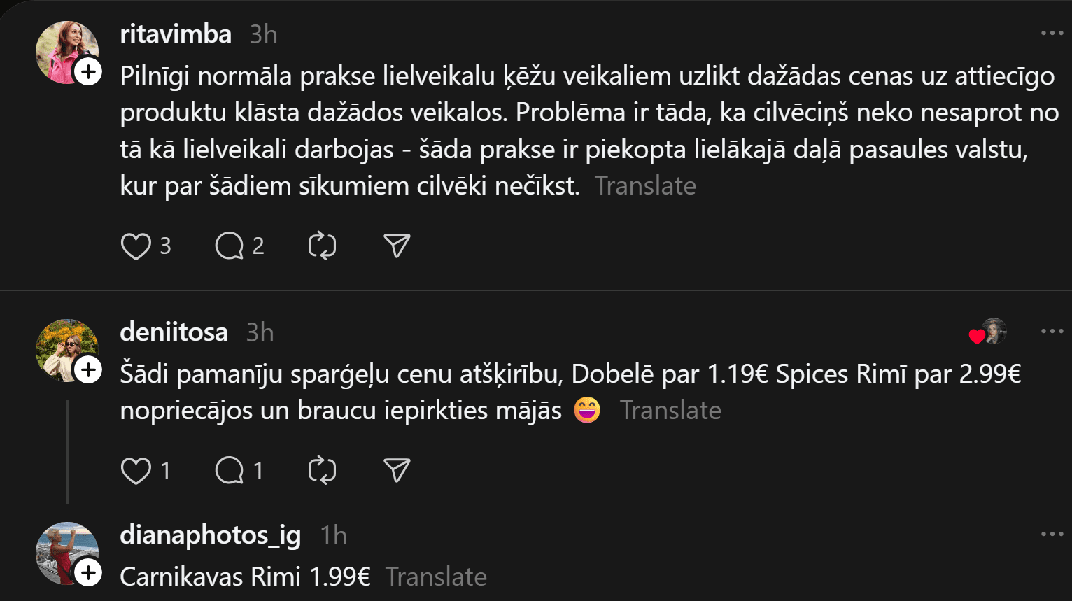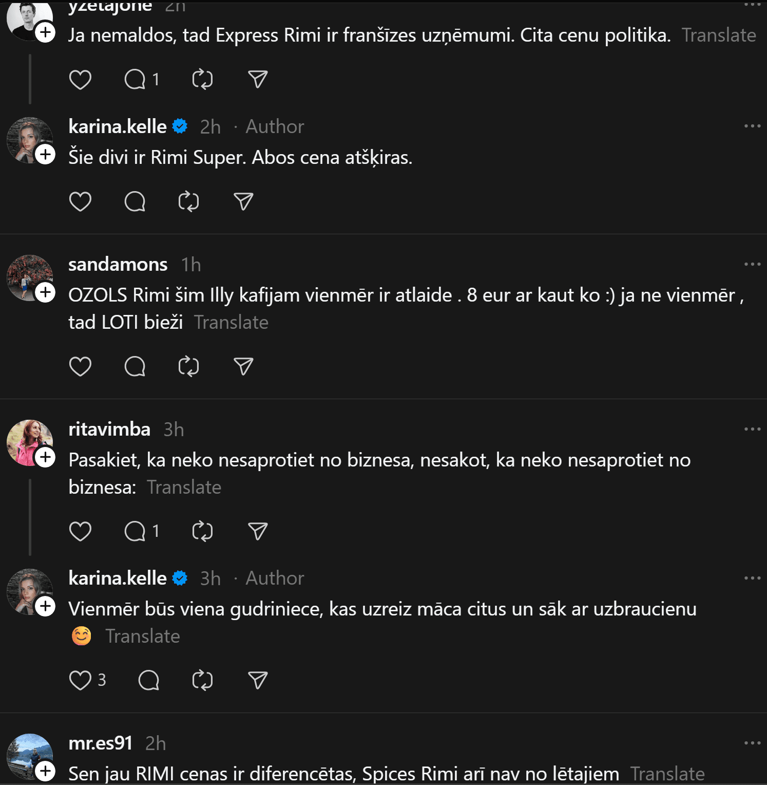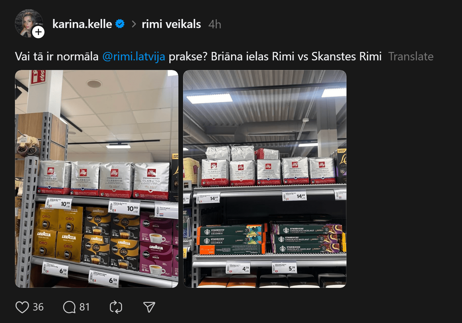 “Vai tā ir normāla “Rimi Latvia” prakse? Briāna ielas Rimi pret Skanstes Rimi,” neizpratni vietnē “Threads” pauž Karīna. Viņas pievienotajā fotoattēlā redzams, ka vienā “Rimi” veikalā “illy” kafija maksā 10,99 eiro, bet citā – 14,69 eiro.