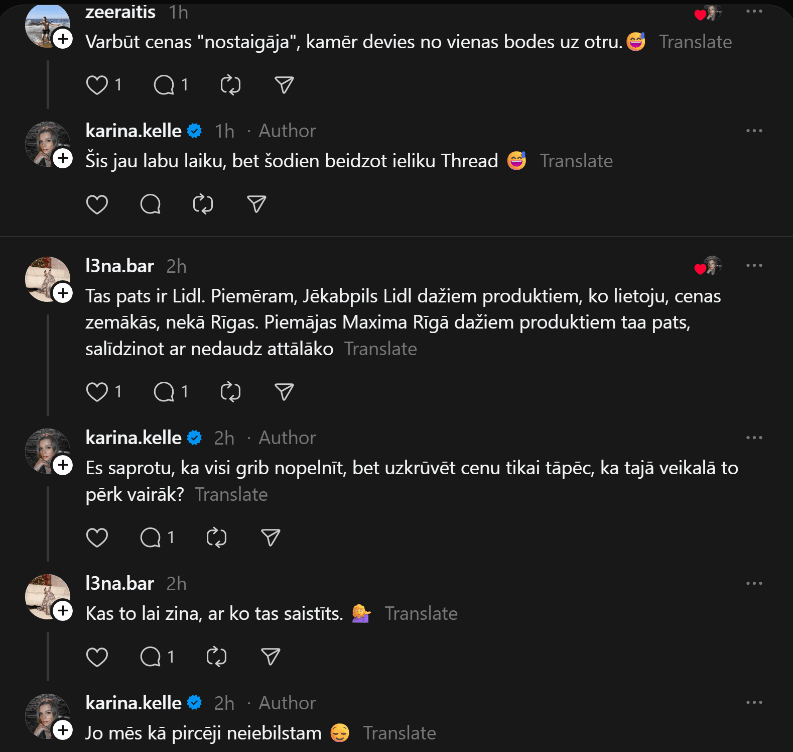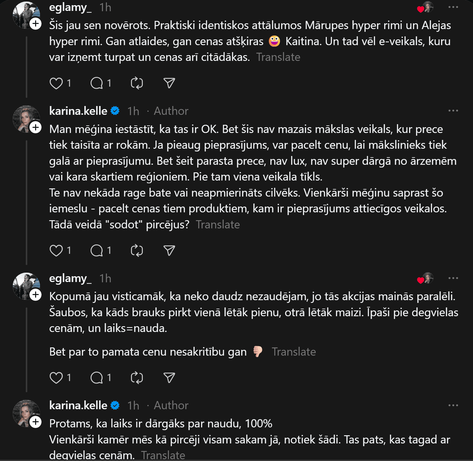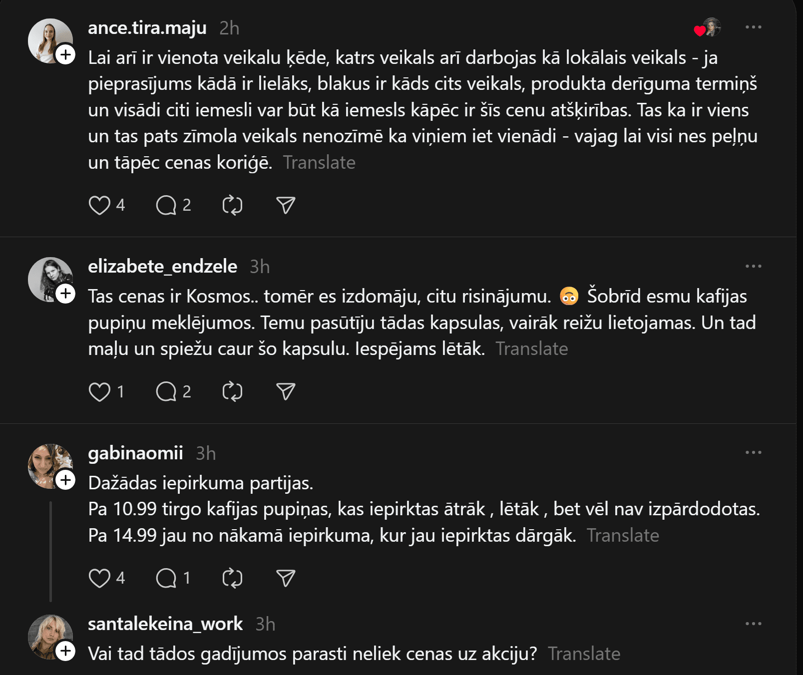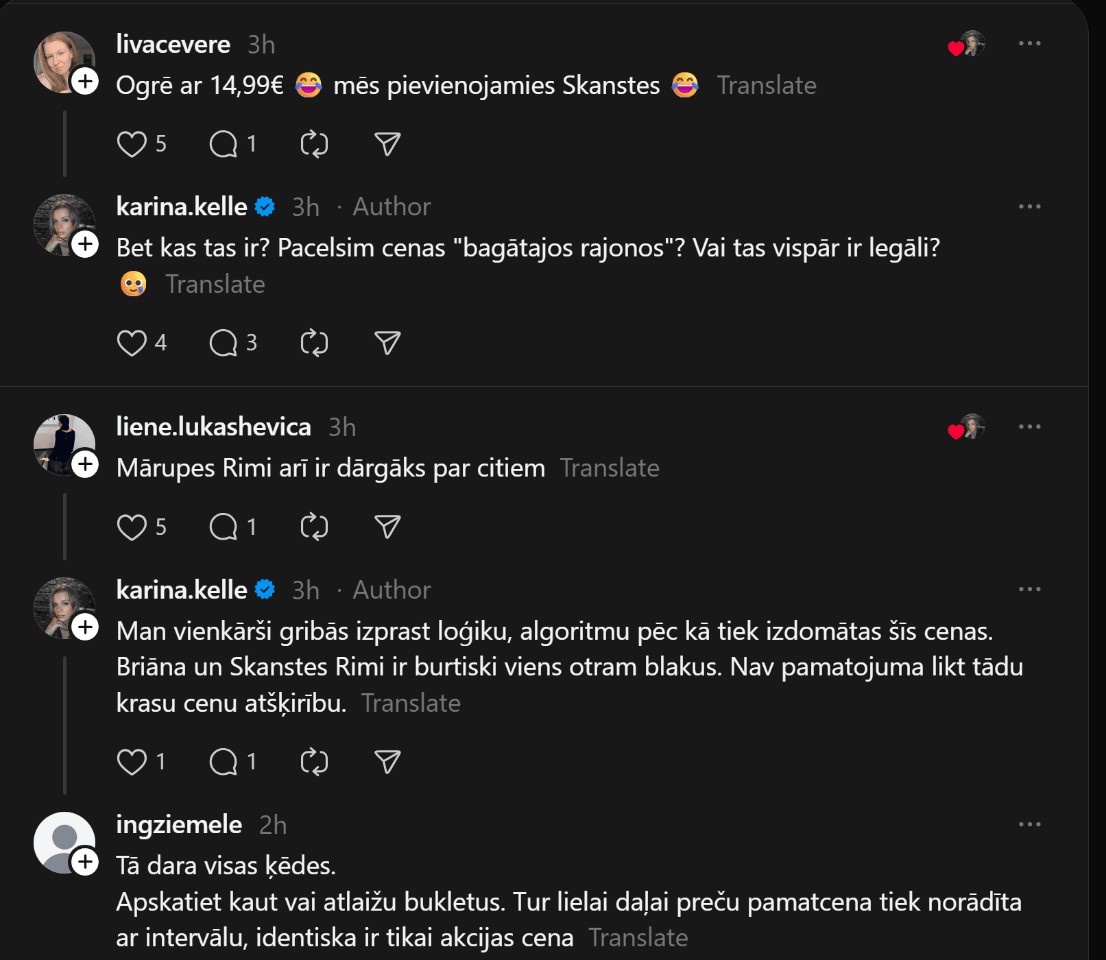 “Vai tā ir normāla “Rimi Latvia” prakse? Briāna ielas Rimi pret Skanstes Rimi,” neizpratni vietnē “Threads” pauž Karīna. Viņas pievienotajā fotoattēlā redzams, ka vienā “Rimi” veikalā “illy” kafija maksā 10,99 eiro, bet citā – 14,69 eiro.