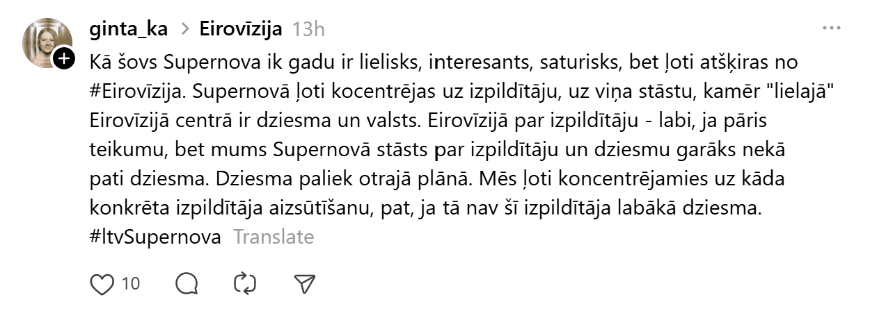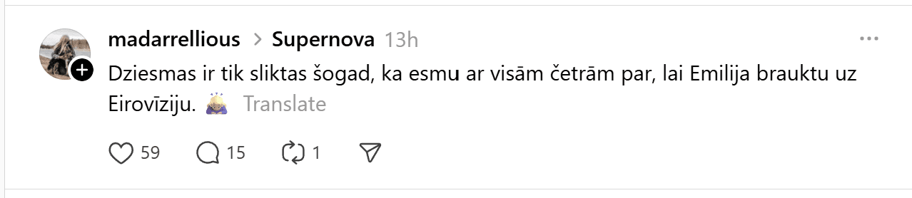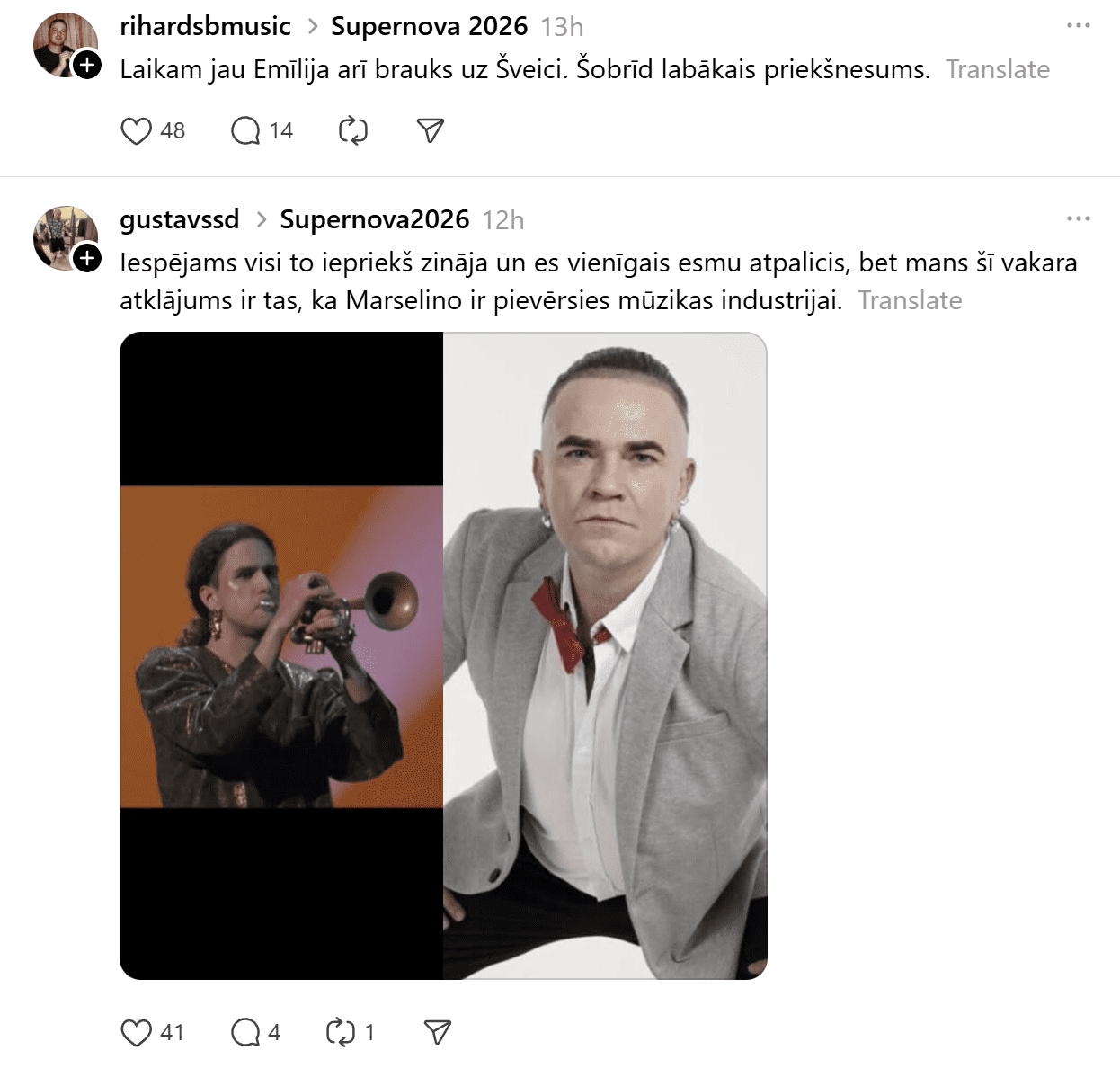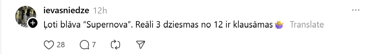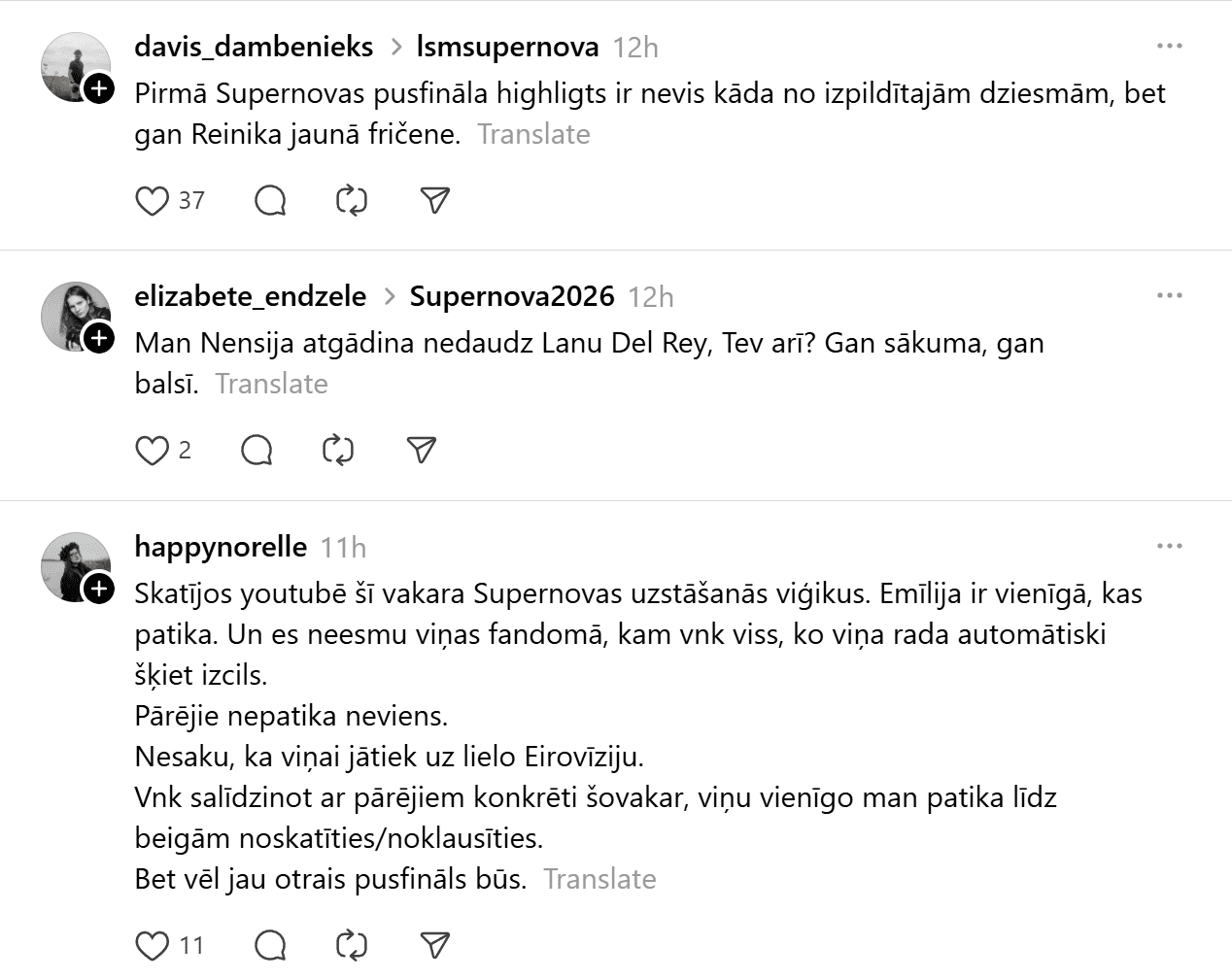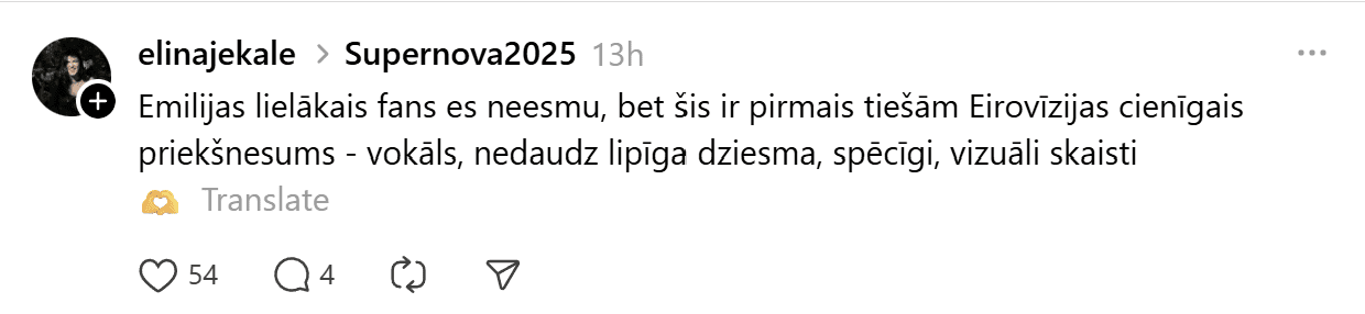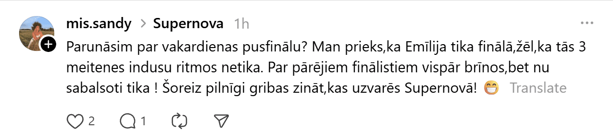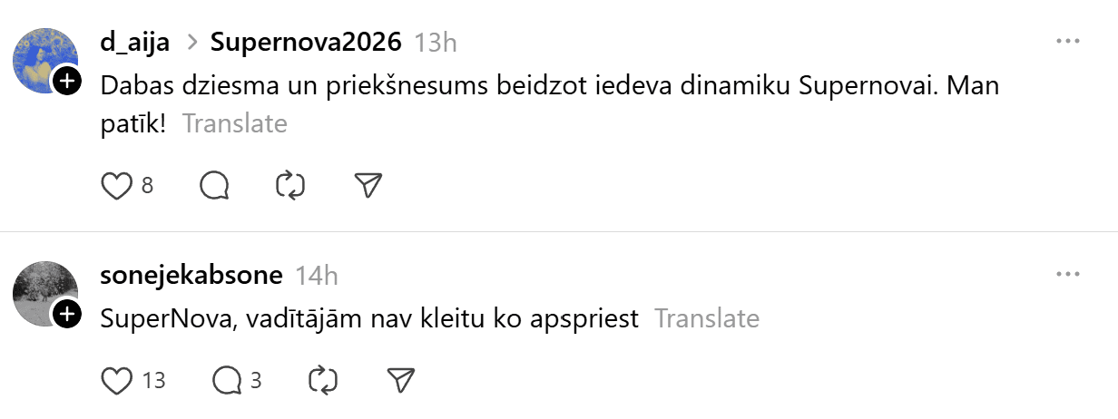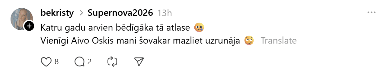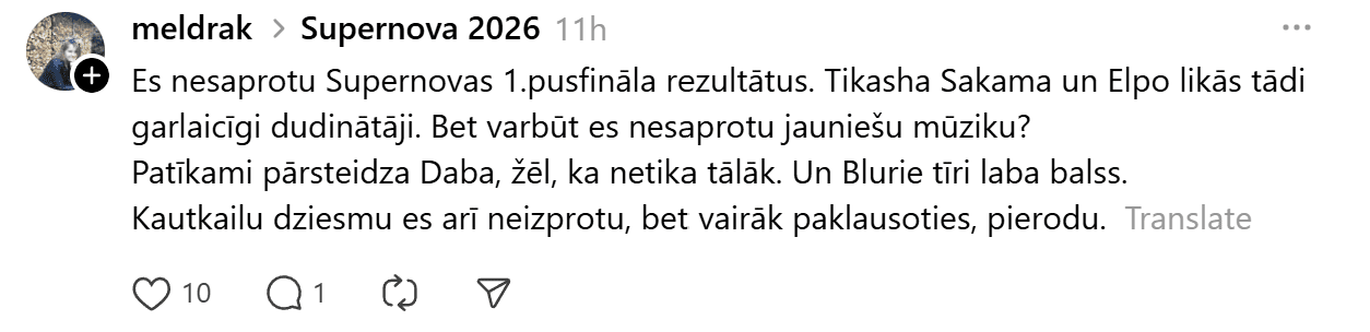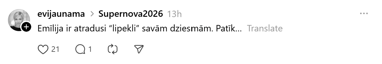 Sestdien noskaidroti pirmie Latvijas Sabiedriskā medija (LSM) dziesmu konkursa “Supernova” fināla dalībnieki. Konkursa finālā iekļuva “Kautkaili” ar dziesmu “Te un tagad”, “De Mantra” ar dziesmu “Let Them”, Emilija ar dziesmu “All We Ever Had”, Tikasha Sakama ar dziesmu “#010126 CODA” un “Elpo” ar dziesmu “Blakus”. Tikmēr sociālajā platformā “Threads” jau izkristalizējies galvenais favorīts.