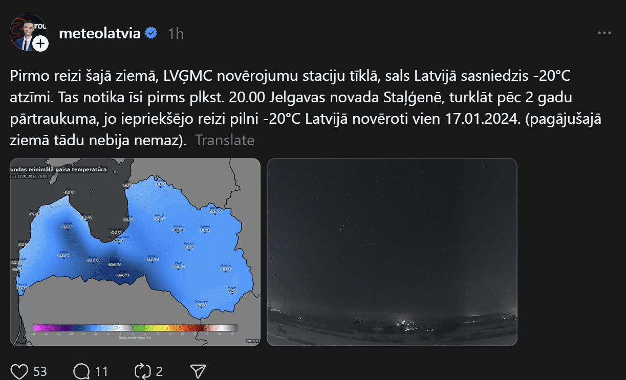 “Pirmo reizi šajā ziemā, LVĢMC novērojumu staciju tīklā, sals Latvijā sasniedzis -20°C atzīmi. Tas notika īsi pirms plkst. 20.00 Jelgavas novada Staļģenē, turklāt pēc 2 gadu pārtraukuma, jo iepriekšējo reizi pilni -20°C Latvijā novēroti vien 17.01.2024. (pagājušajā ziemā tādu nebija nemaz),” soctīklos publicē Mārtiņš Bergšteins.