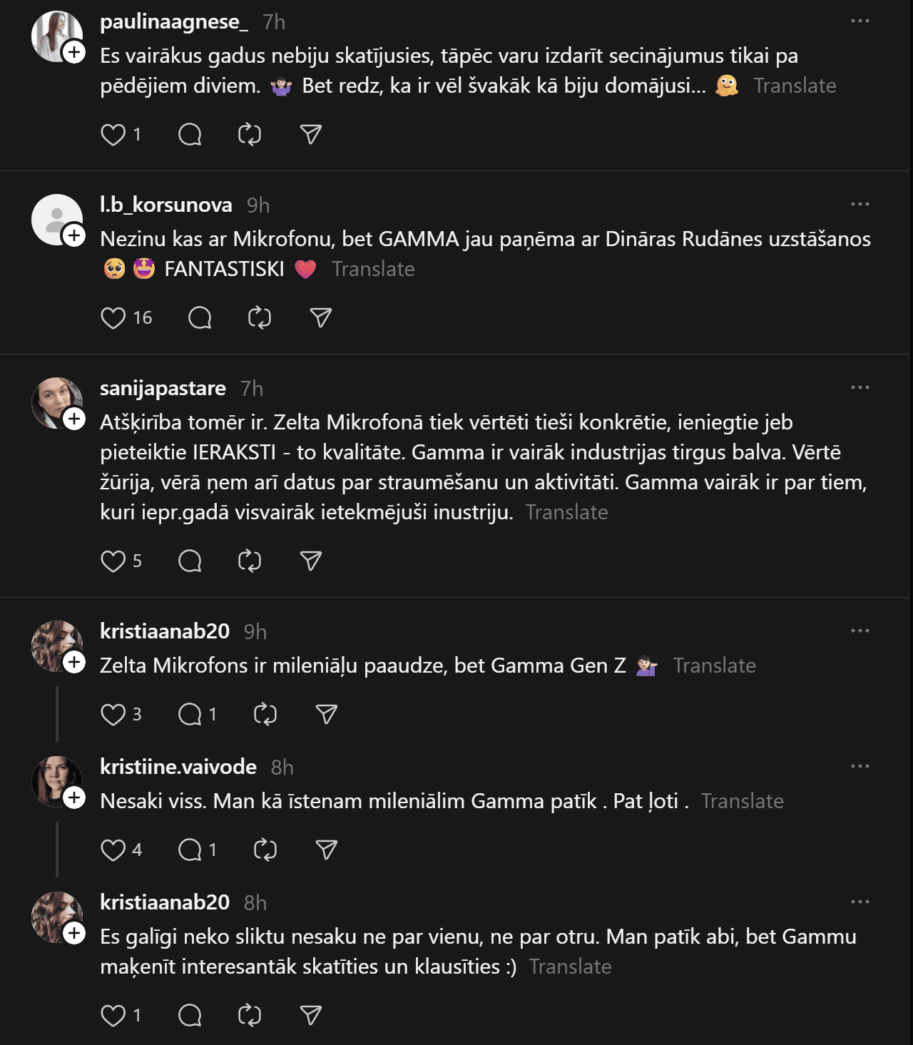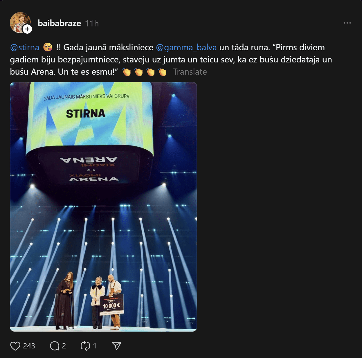 Cilvēki bija sajūsmā par Stirnas pateicības runu, kuru viņa sāka ar vārdiem “Pirms diviem gadiem es biju bezpajumtniece! Es toreiz, stāvot uz jumta, teicu, ka es būšu mūziķe un būšu Arēnā. Tagad, divus gadus vēlāk es esmu mūziķe un esmu Arēnā. Es vēlos šo balvu darīt ar katru, kurš jūtas par vēlu, par vāju, ja mans stāsts un ceļš var iedvesmot kādu, ir vērts cīnīties!” Stirna sacīja.
