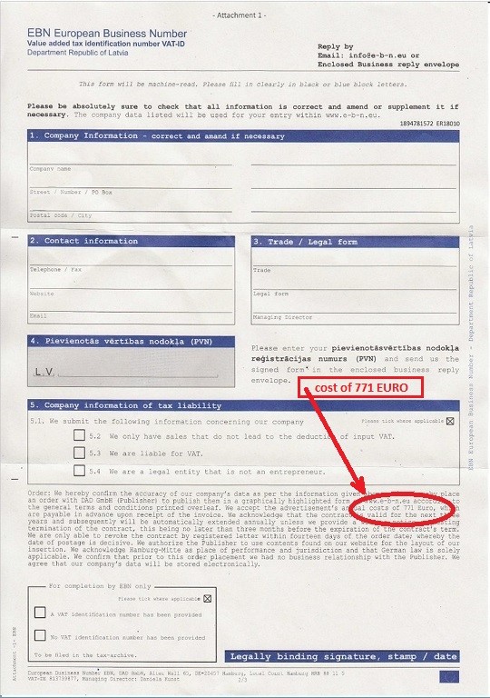 Policija ir konstatējusi, ka personas, kuras ir saņēmušās piedāvājumus no šādām organizācijām, maldīgi uzskata tos par bezmaksas un, rūpīgi neiepazīstoties ar pielikumā esošās veidlapas saturu, neapzināti piekrīt izvirzītajiem maksas nosacījumiem. Šādām vēstulēm parasti tiek pievienota veidlapa ar atpakaļ sūtīšanai apmaksātu aploksni, kuras teksta daļā grūti uztveramā veidā norādīts, ka par minēto pakalpojumu tiks iekasēta ikmēneša maksa.