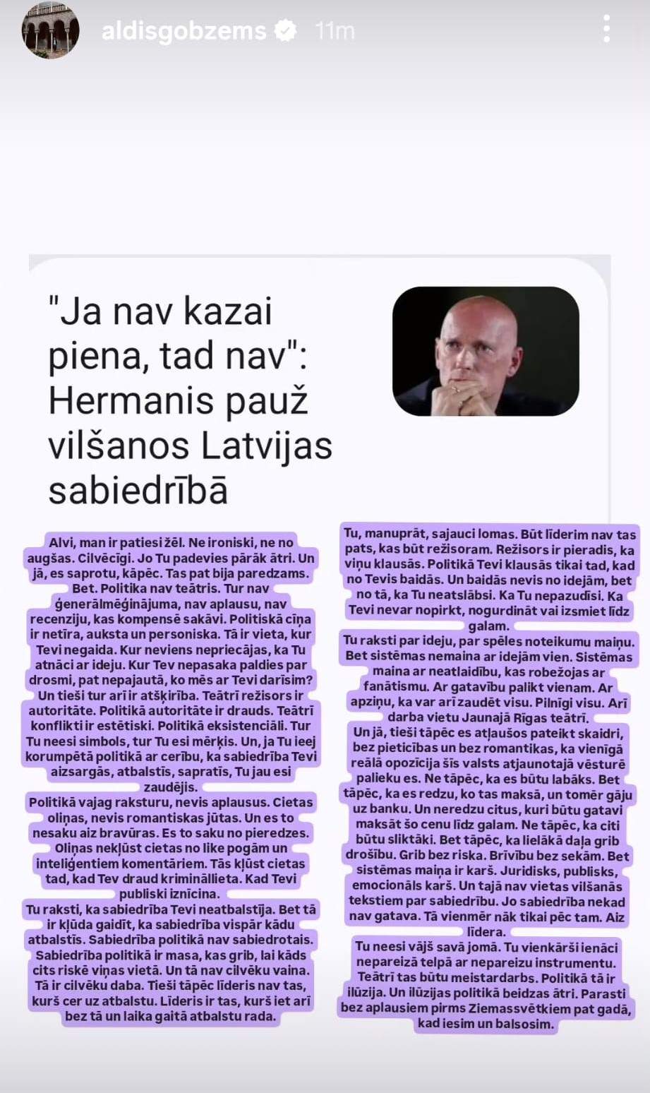 Šodien LA.LV portālā jau vēstījām par Alvja Hermaņa izteikumiem saistībā ar viņa mēģinājumu ienākt politikā. Tagad viedokli sociālo mediju platformās sākuši paust arī citi. Piemēram, Aldis Gobzems (jeb Arigo Toro) īso stāstiņu sadaļā savā “Instagram” profilā paudis savas pārdomas.
