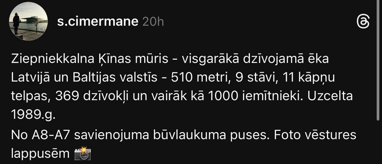 Sigita platformā “Threads” raksta: “Ziepniekkalna Ķīnas mūris – visgarākā dzīvojamā ēka Latvijā un Baltijas valstīs – 510 metri, 9 stāvi, 11 kāpņu telpas, 369 dzīvokļi un vairāk nekā 1000 iemītnieki. Uzcelta 1989.gadā.”