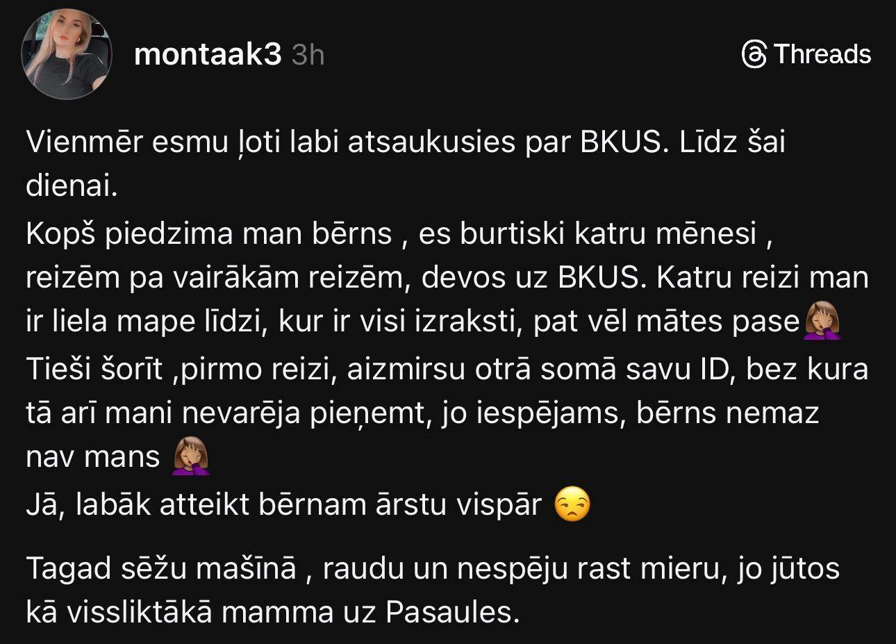 “Vienmēr esmu ļoti labi atsaukusies par BKUS. Līdz šai dienai. Kopš piedzima man bērns, es burtiski katru mēnesi, reizēm pa vairākām reizēm, devos uz BKUS. Katru reizi man ir liela mape līdzi, kur ir visi izraksti, pat vēl mātes pase. Tieši šorīt ,pirmo reizi, aizmirsu otrā somā savu ID, bez kura tā arī mani nevarēja pieņemt, jo, iespējams, bērns nemaz nav mans. Jā, labāk atteikt bērnam ārstu vispār. Tagad sēžu mašīnā, raudu un nespēju rast mieru, jo jūtos kā vissliktākā mamma uz Pasaules,” pieredzētajā dalās Monta.